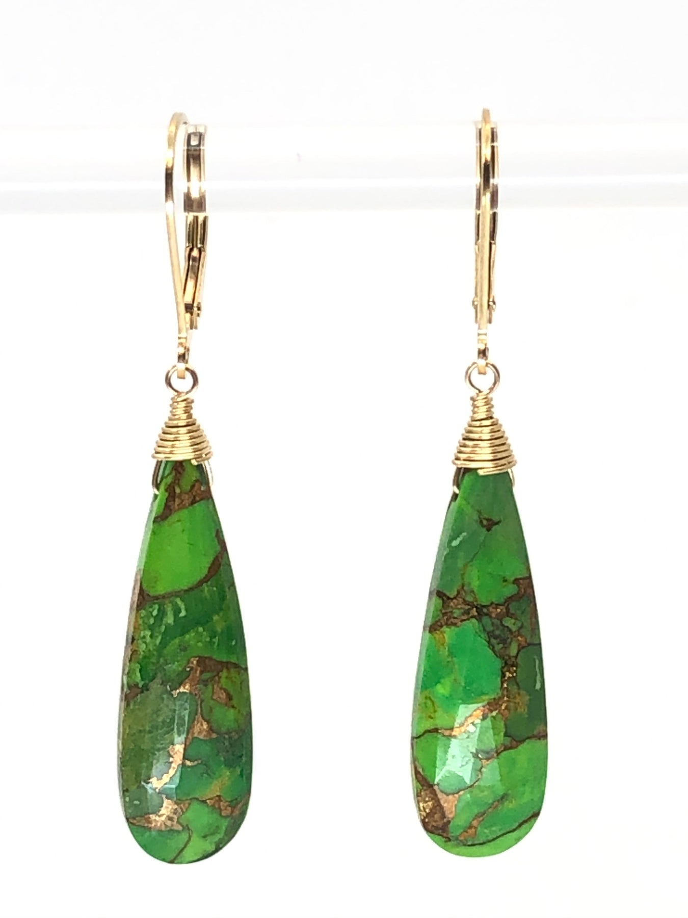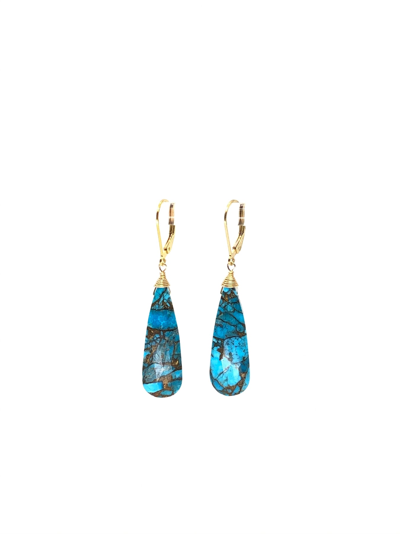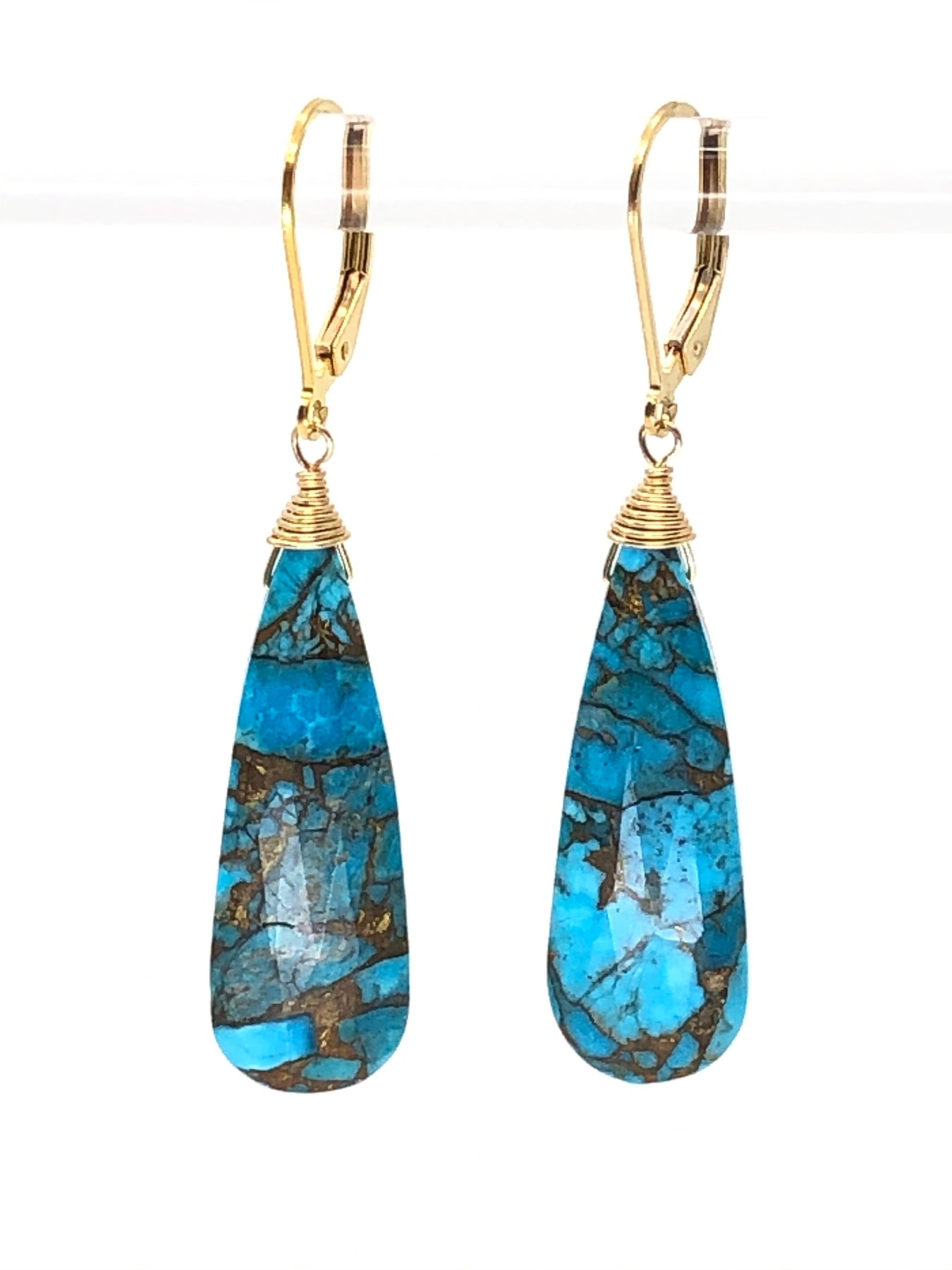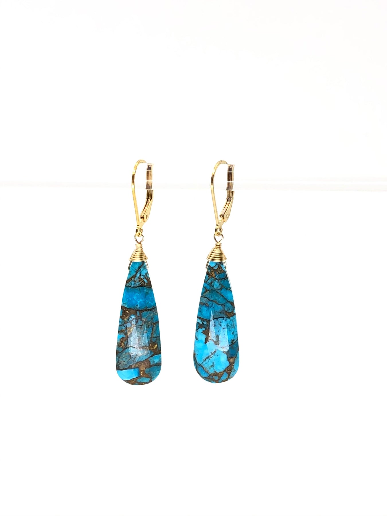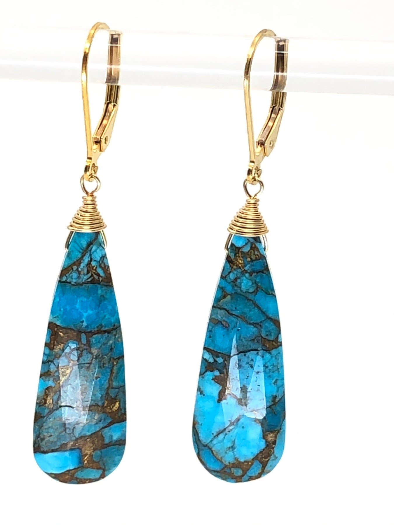 Blue Turquoise cut in an elongated tear drop shape in 14kt gold fill. Gorgeous color and very flattering shape for every face.