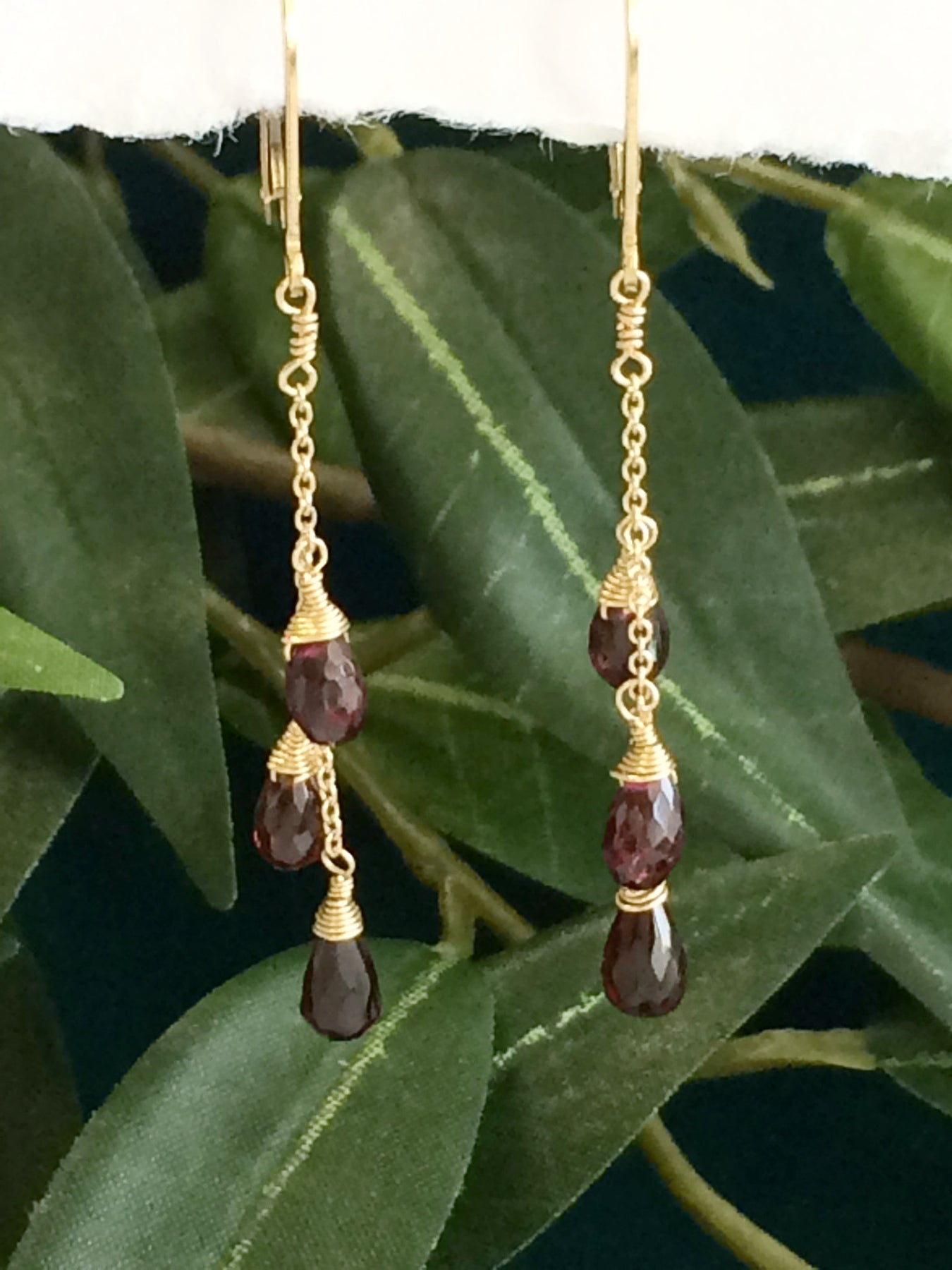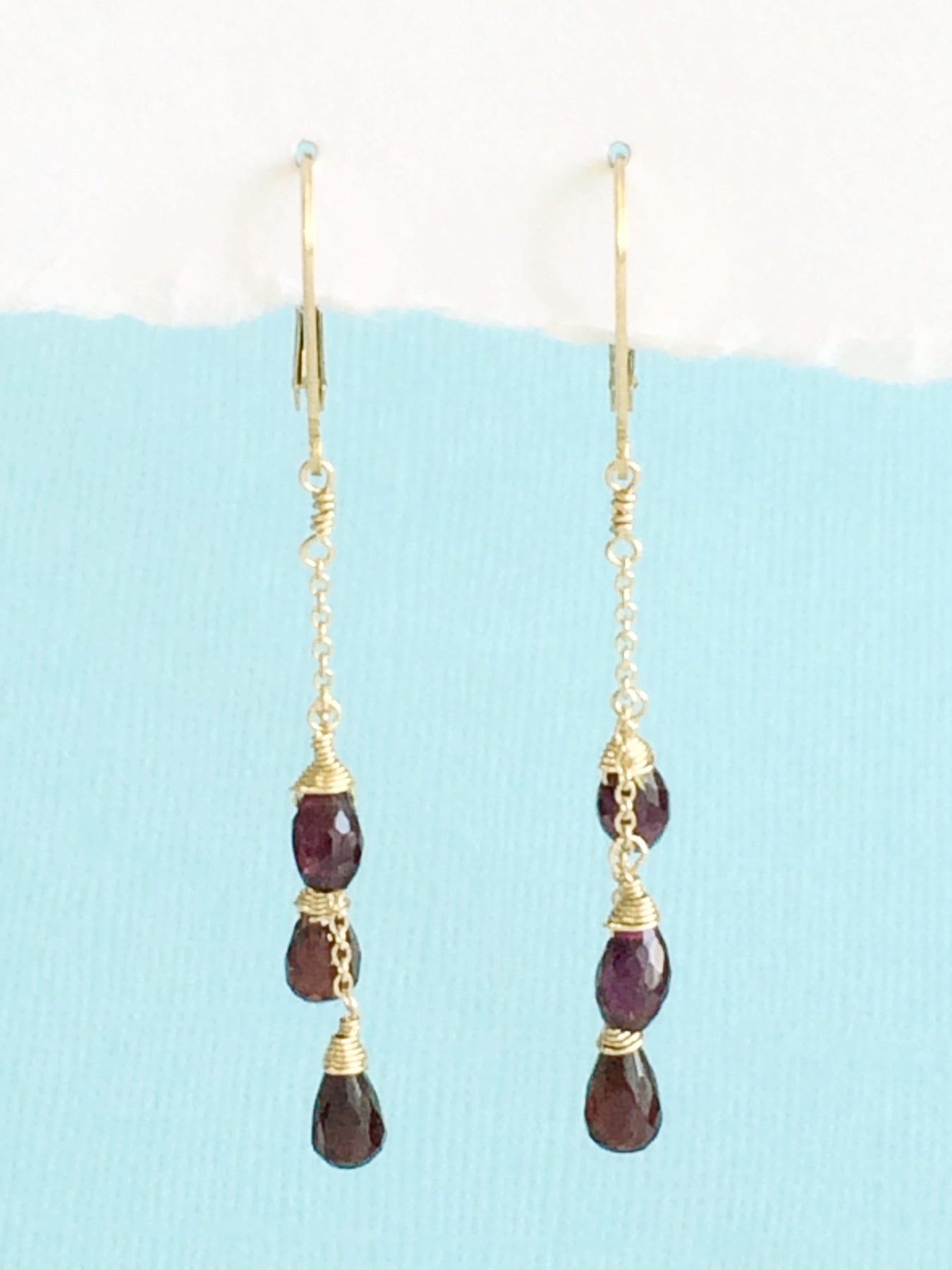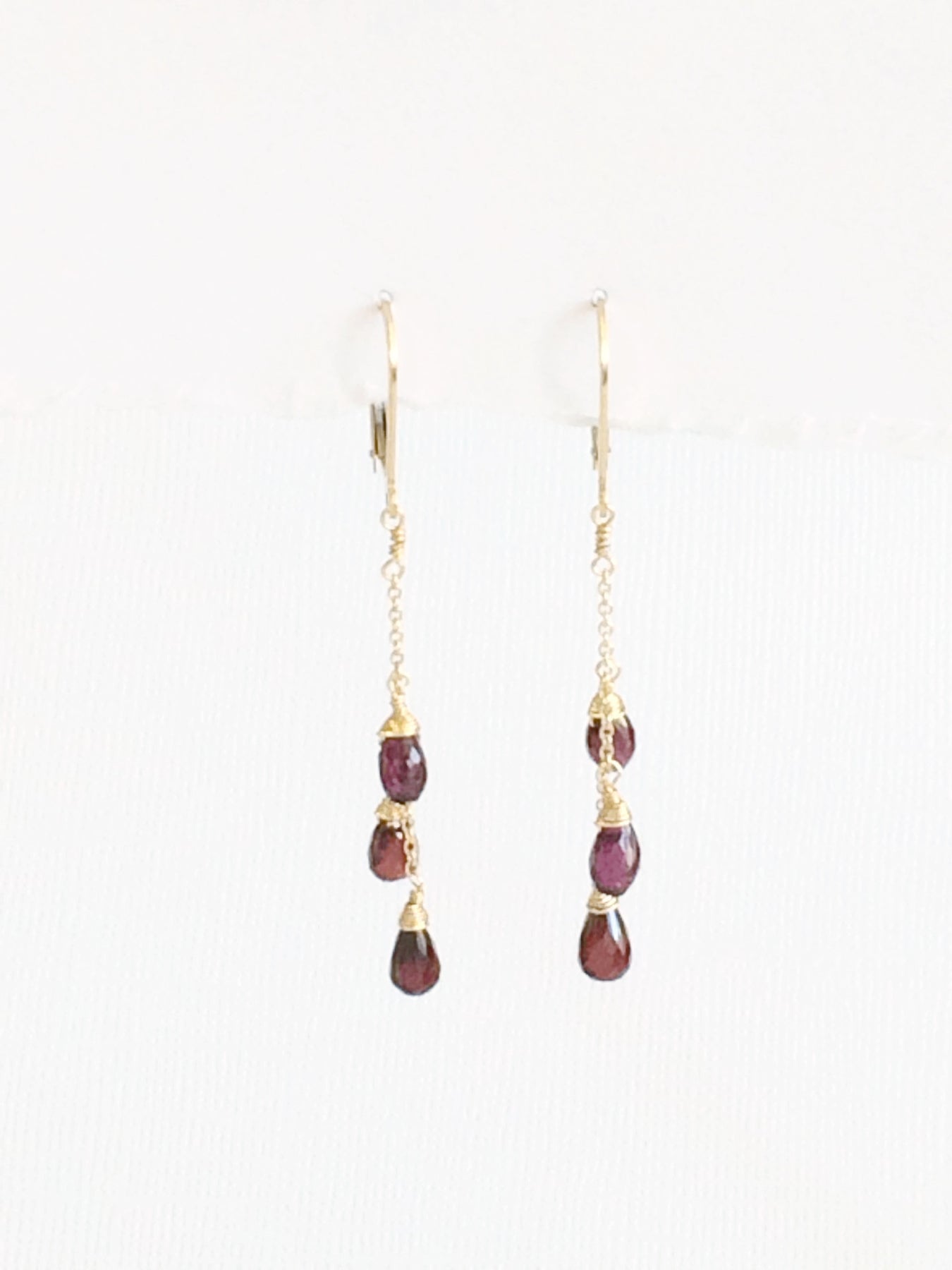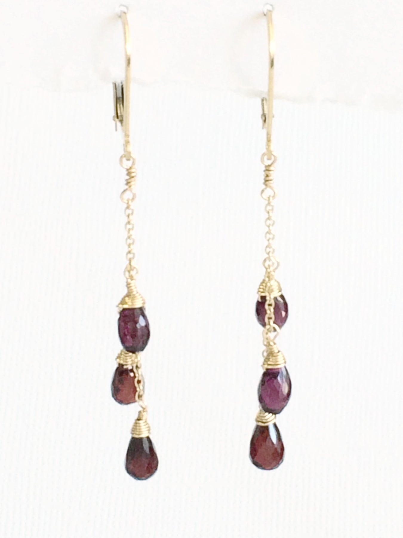 Fun and festive earrings with garnet gem stones on 14kt gold fill chain.