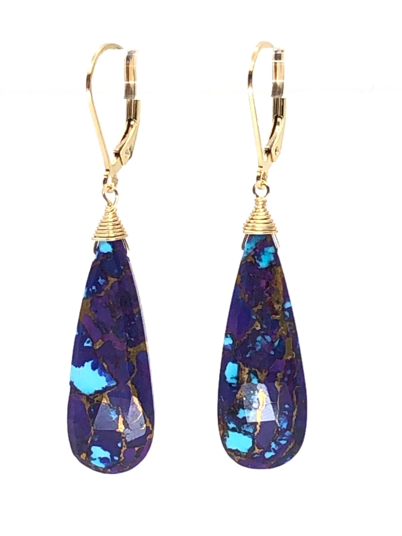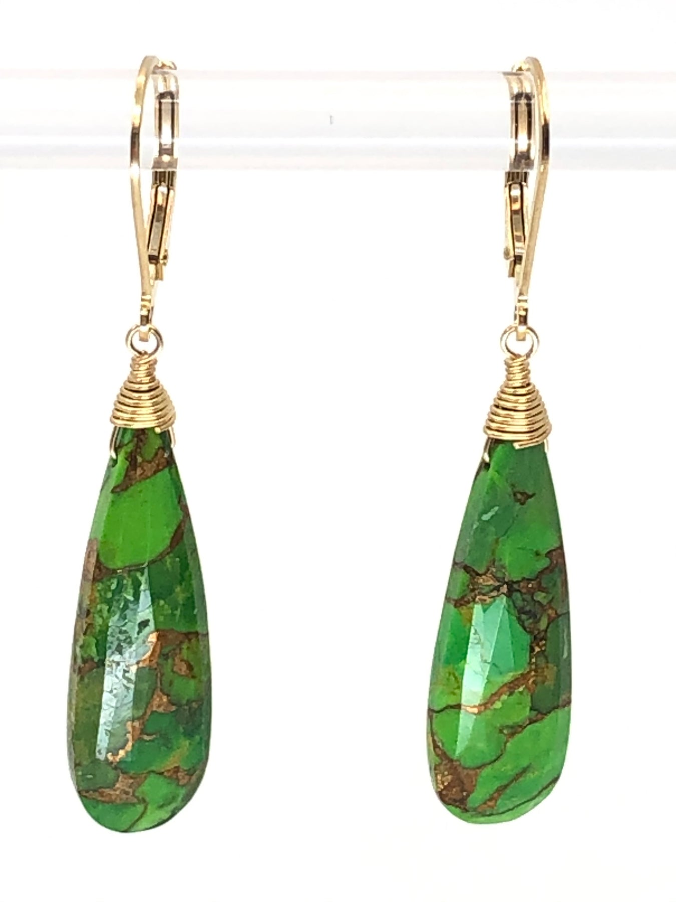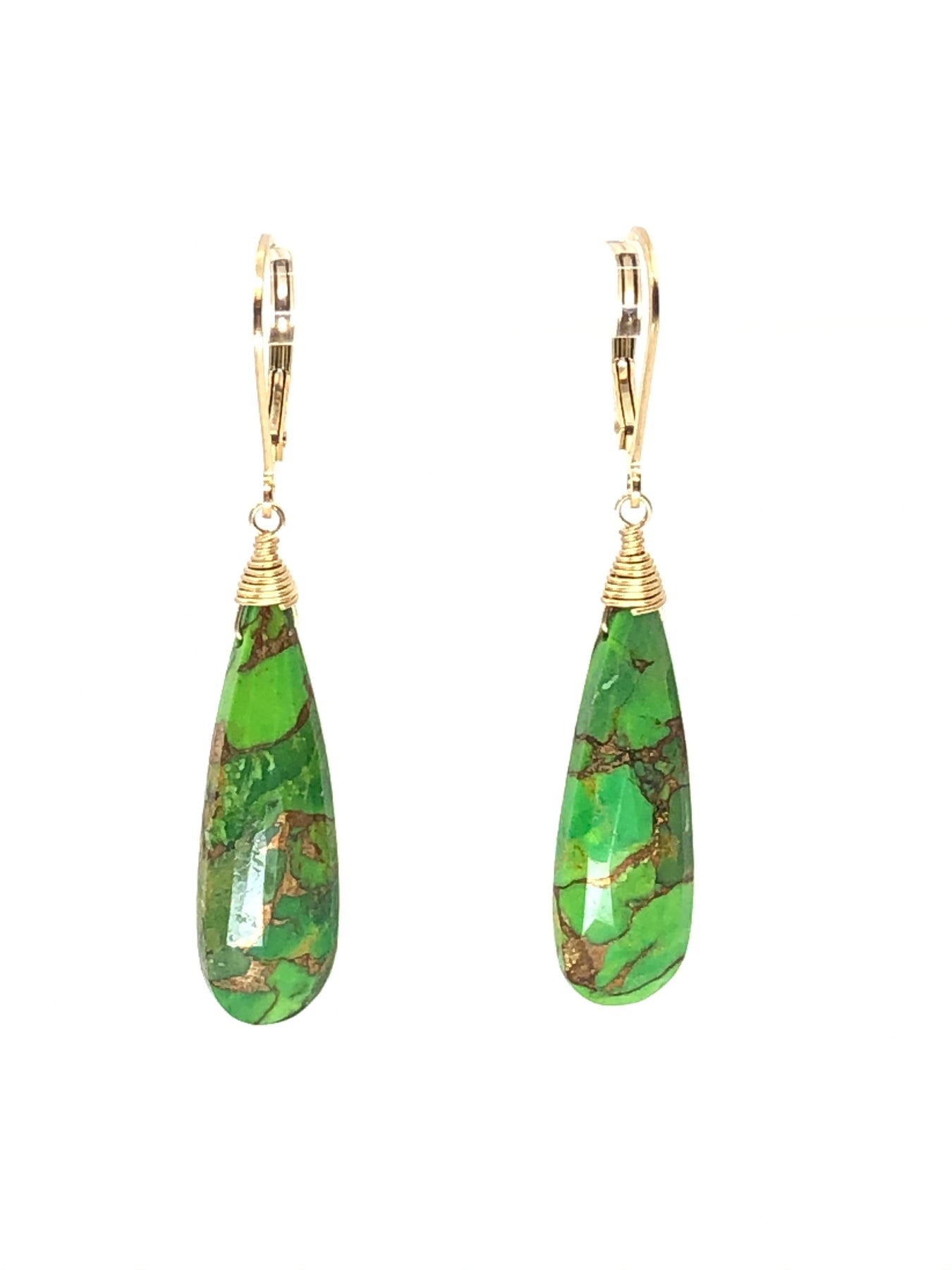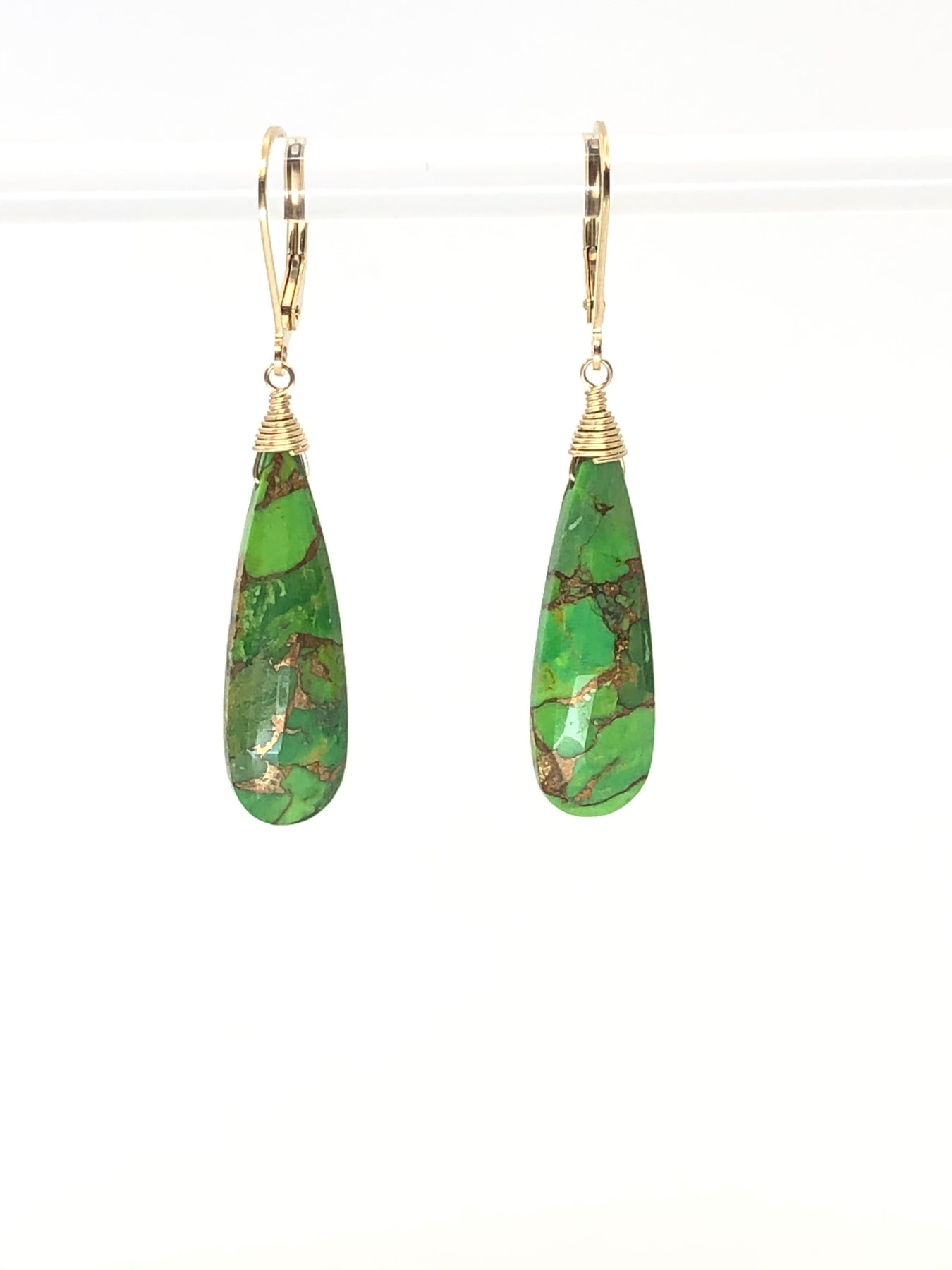 Green Turquoise cut in an elongated tear drop shape in 14kt gold fill. Gorgeous color and very flattering shape for every face.