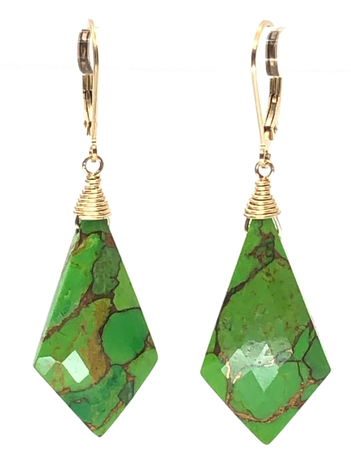 Diamond shape drop earrings in Purple Turquoise for a fun color pop to brighten any day. Earrings are made with 14kt gold fill.