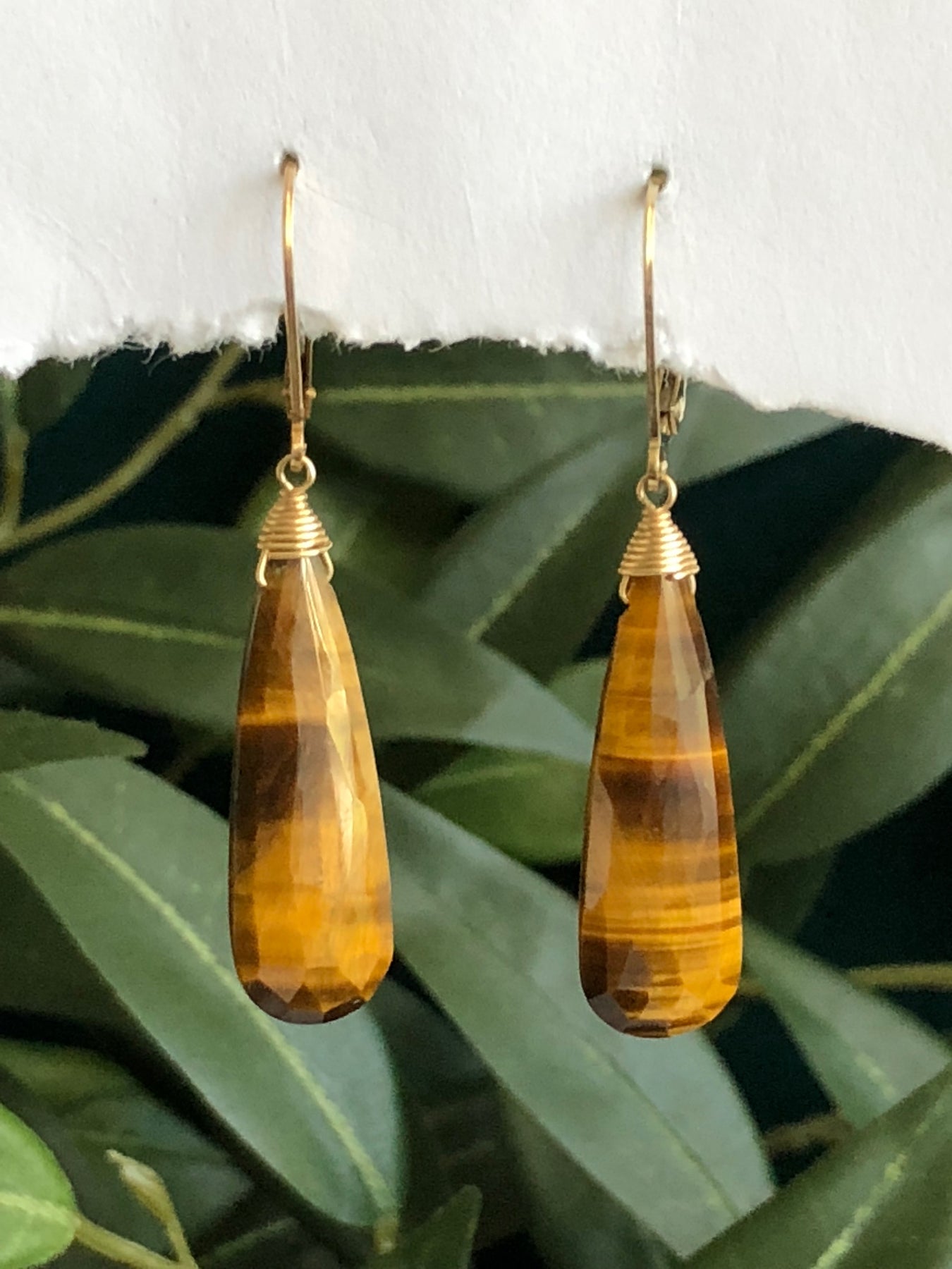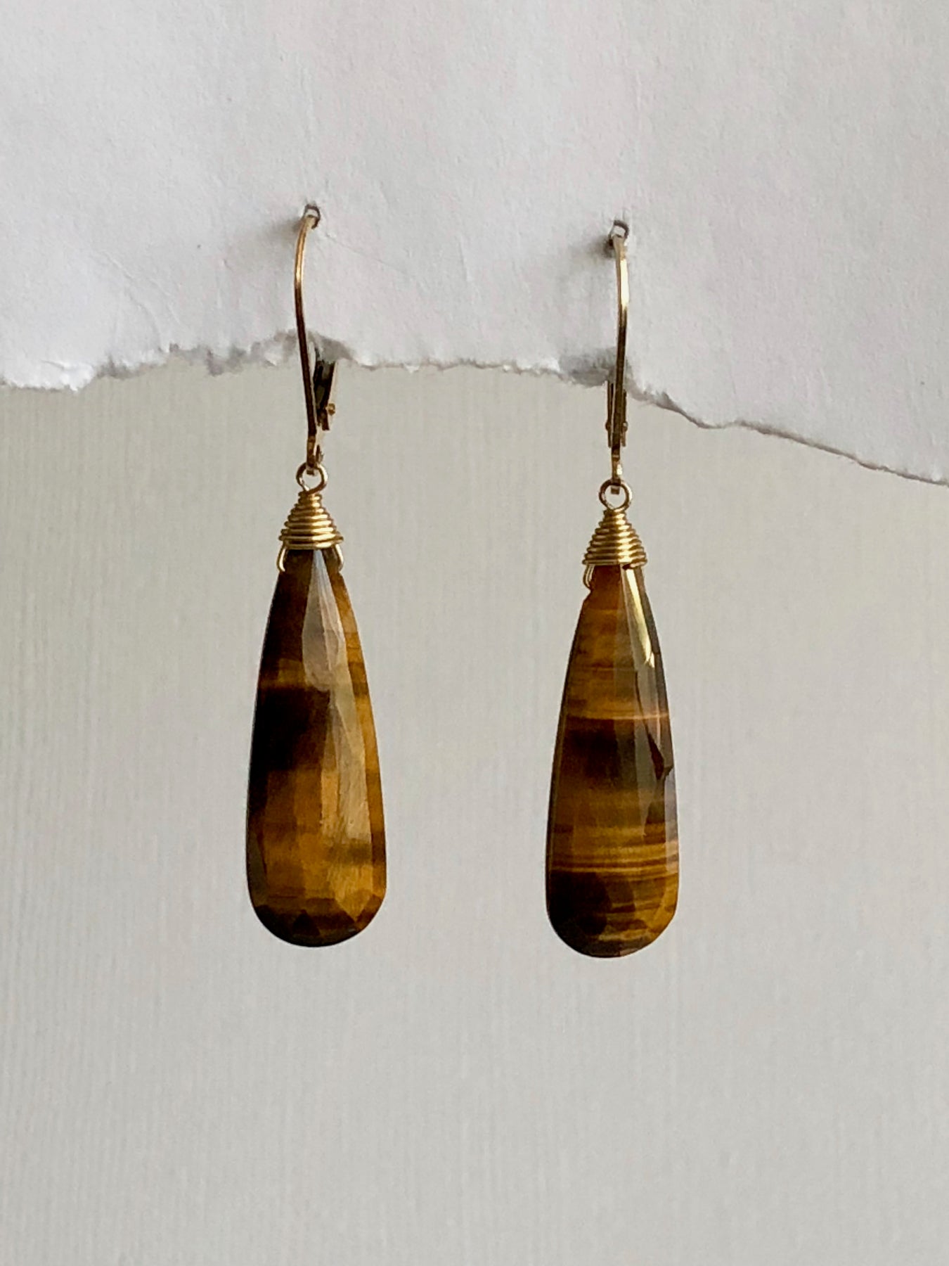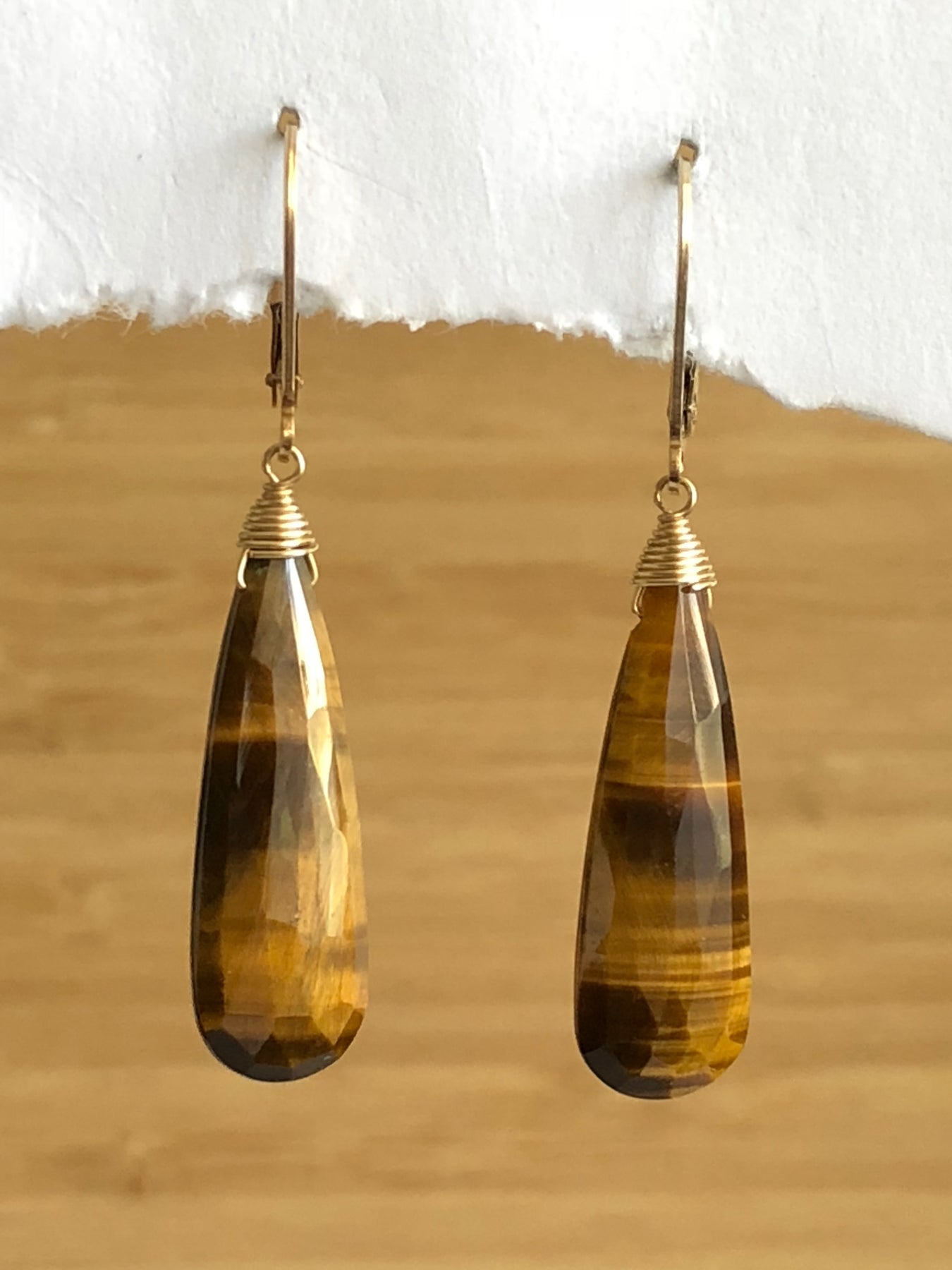 Tiger Eye tear drop earrings wire wrapped with 14k gold fill with a lever back style earwire.