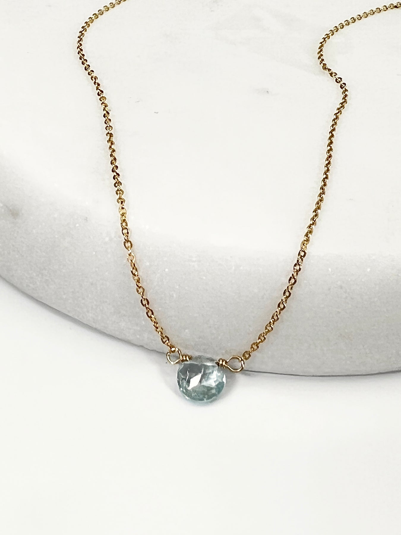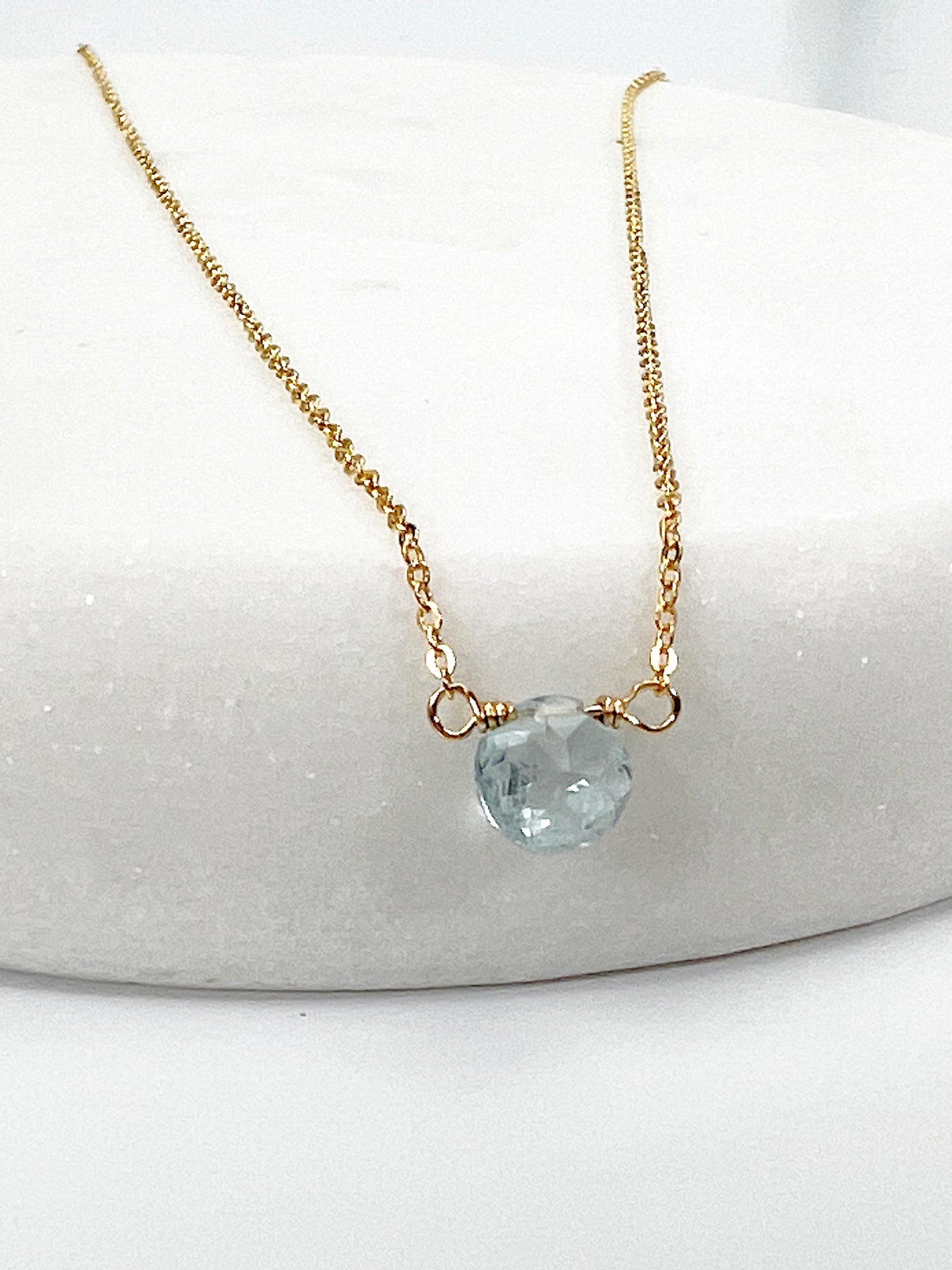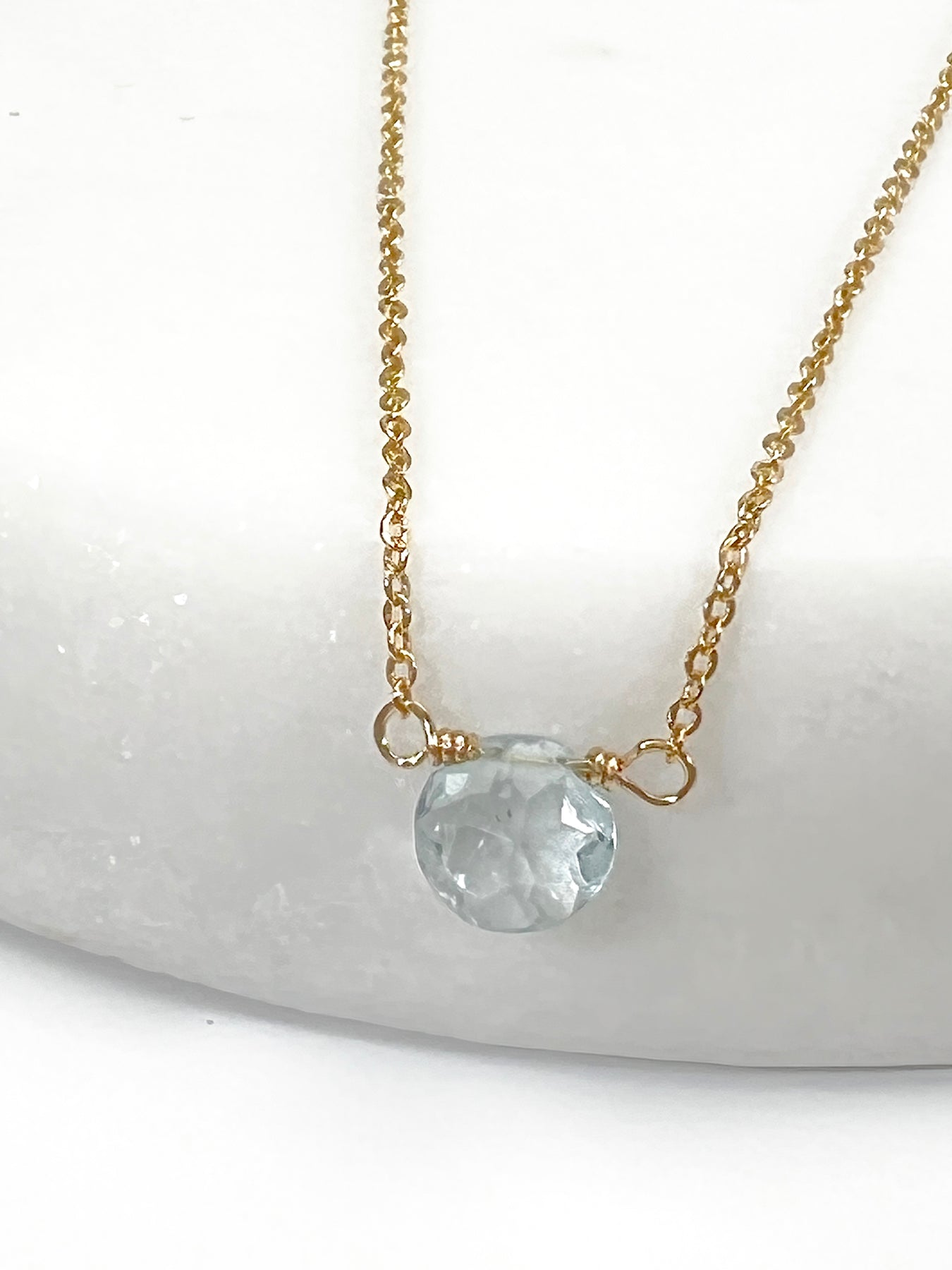 Easy, classic Aquamarine coin necklace perfect for that throw on and go piece. 16" long 14kt gold fill
