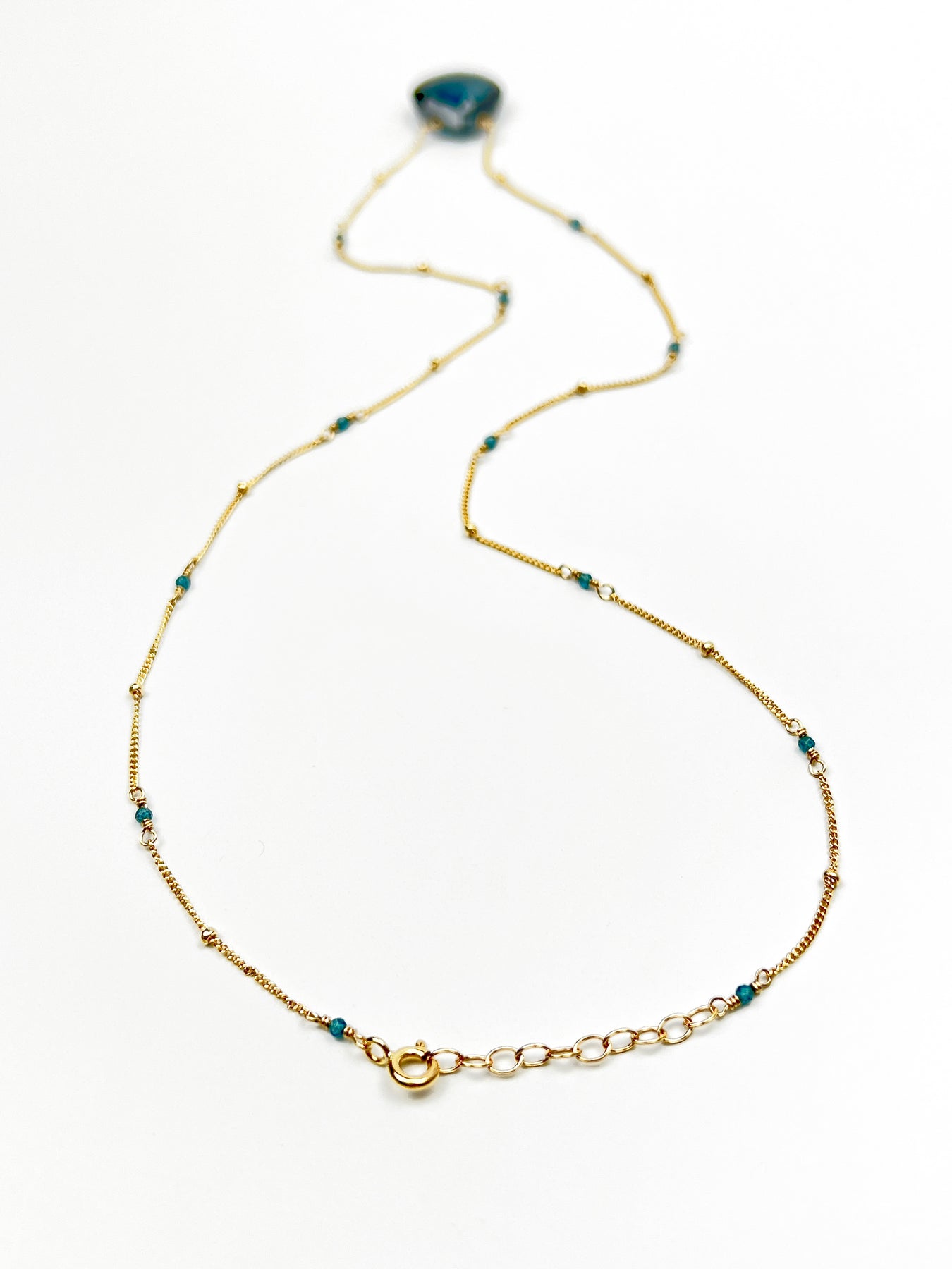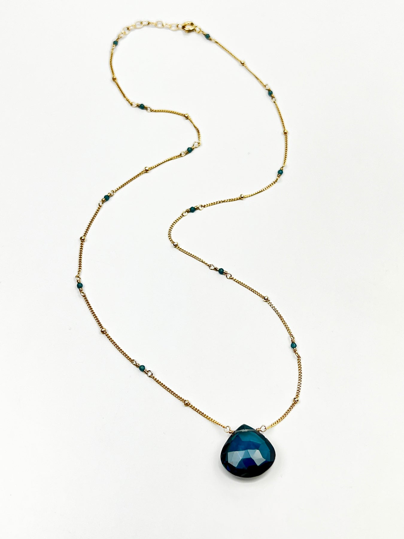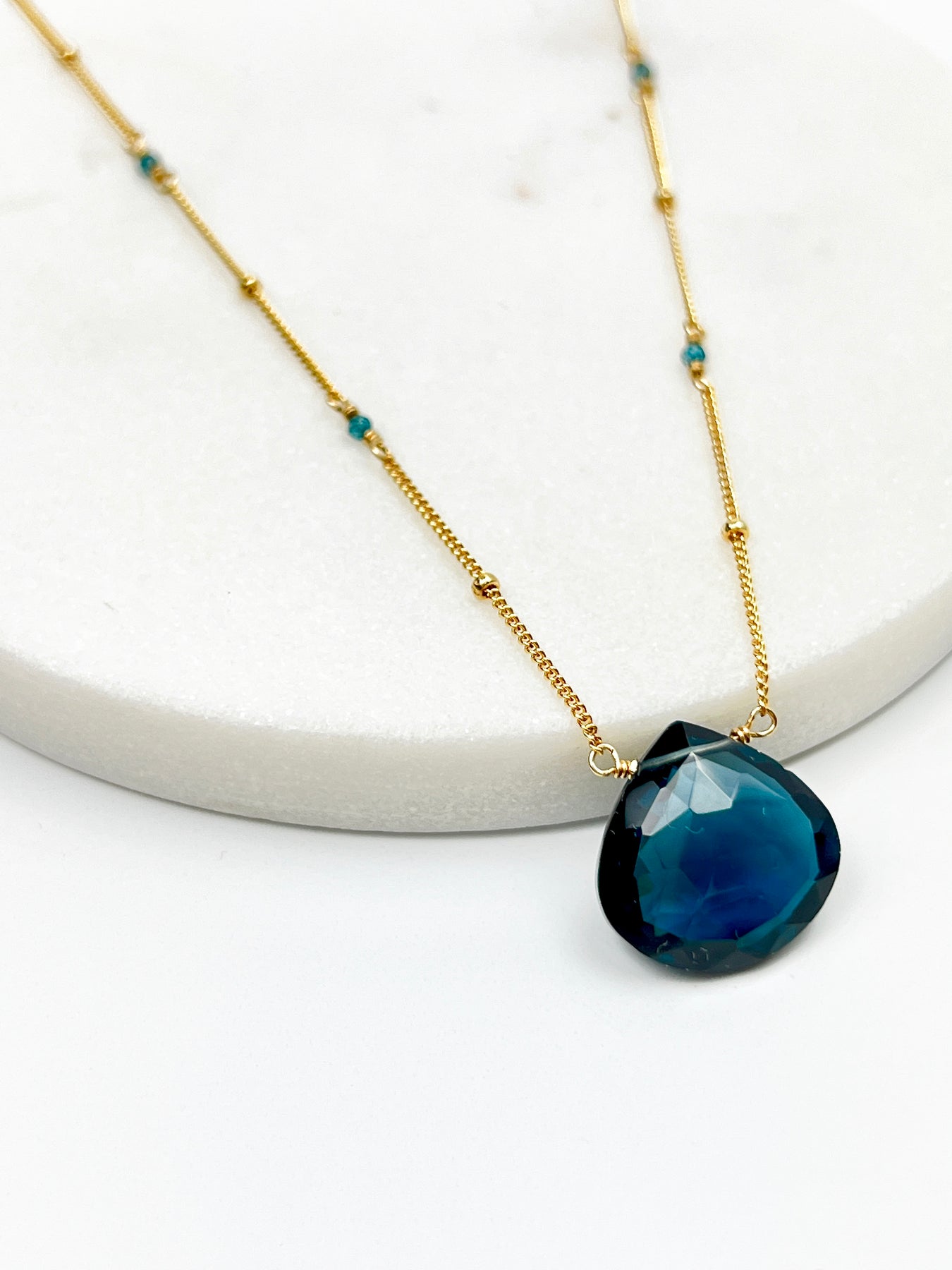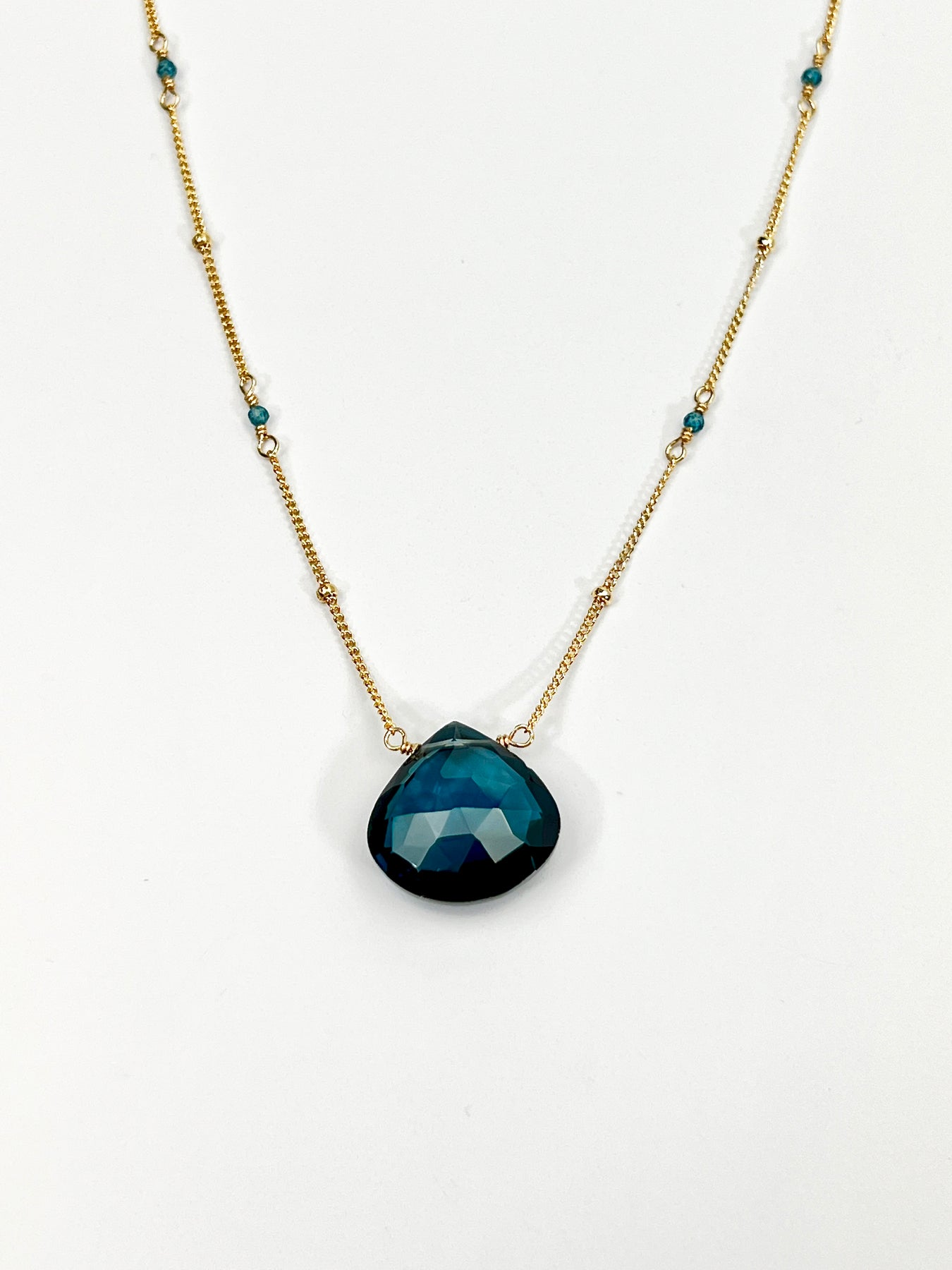 Rich deep London Blue Quartz on a 14kt gold fill chain with London Blue Topaz stones built into the chain. Necklace is 18" long with 1' extender.