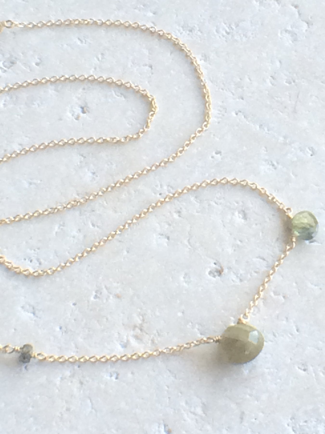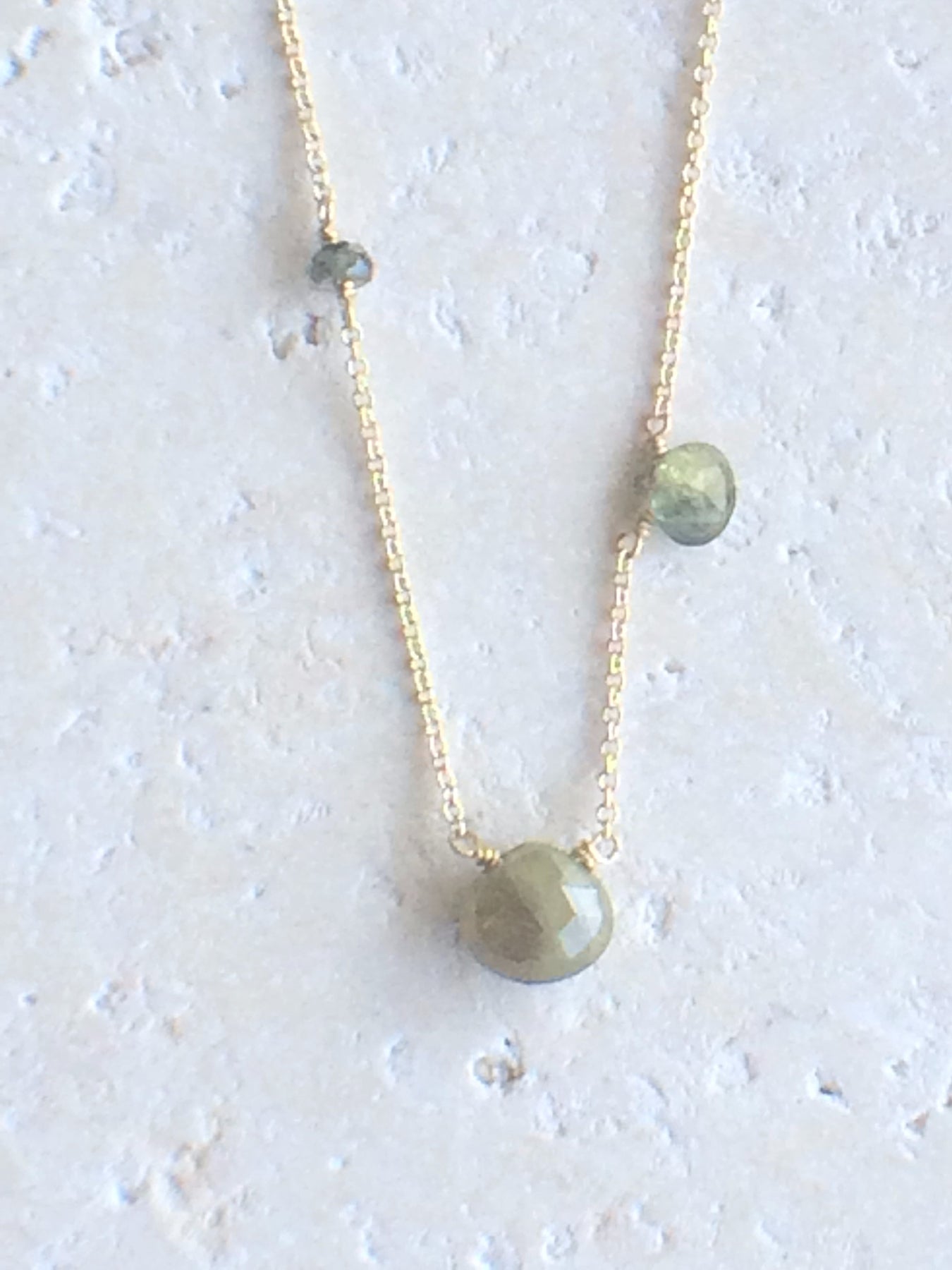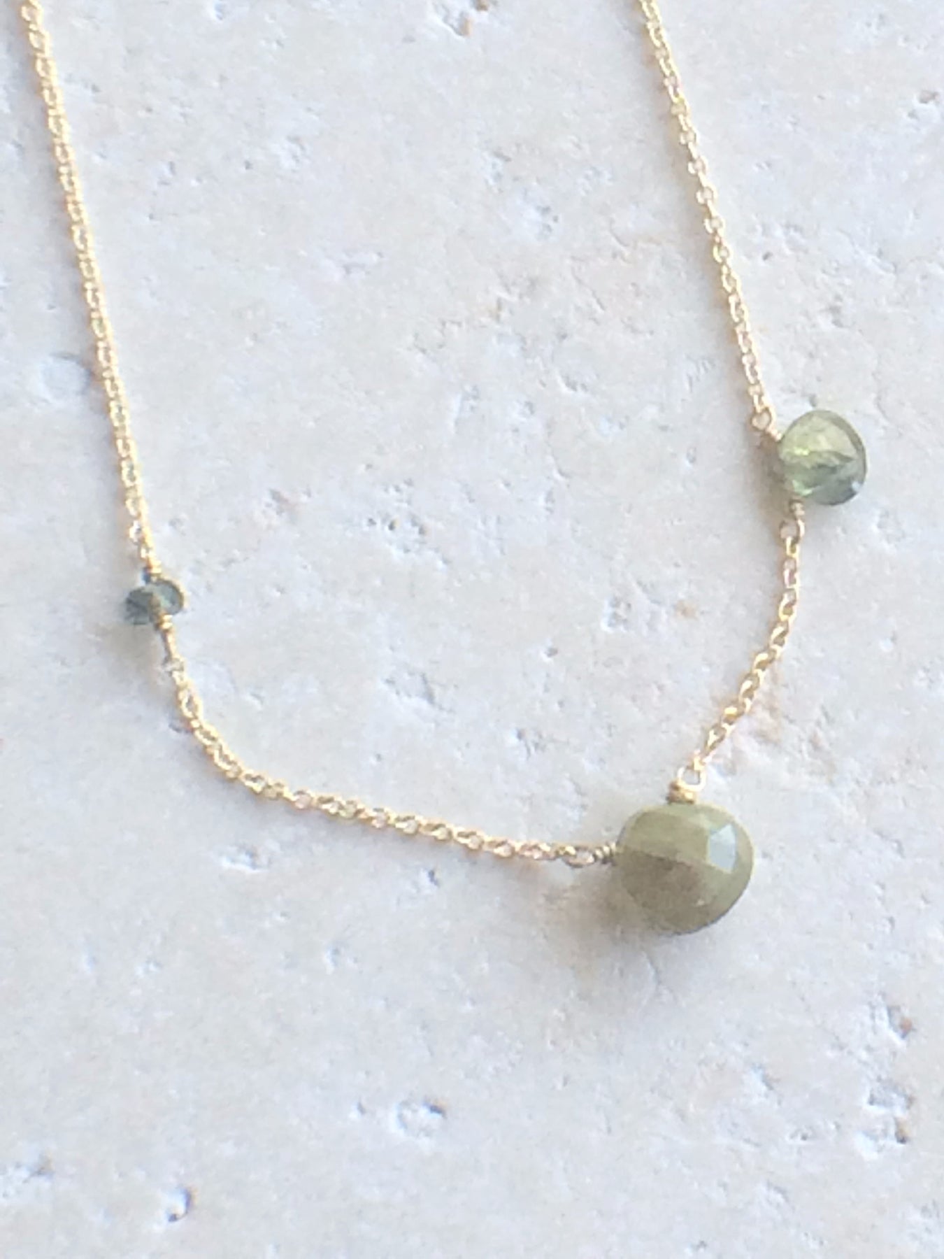 Easy asymmetric necklace with Green Sapphire stones wire wrapped on a 16 - 17" chain in 14kt gold fill.