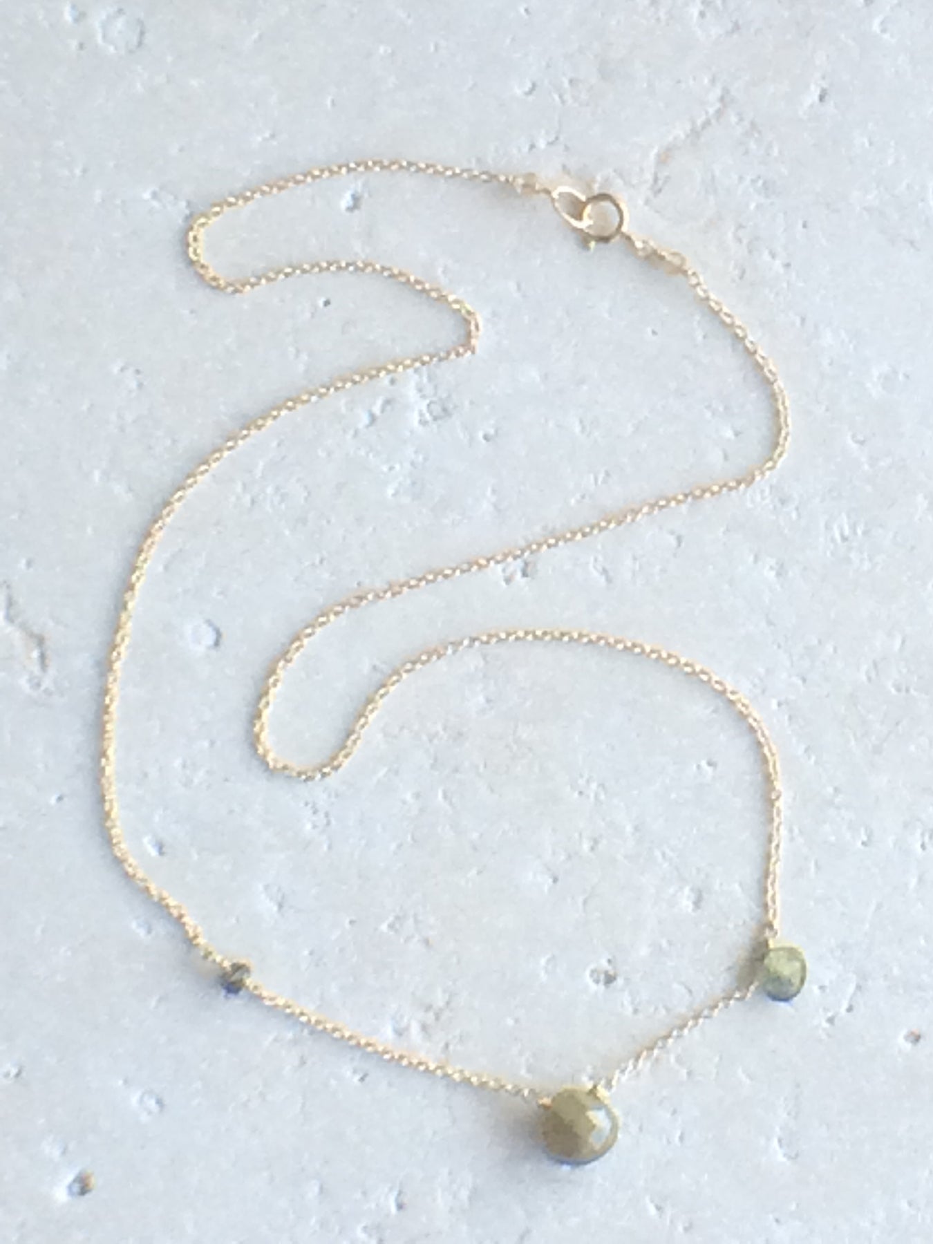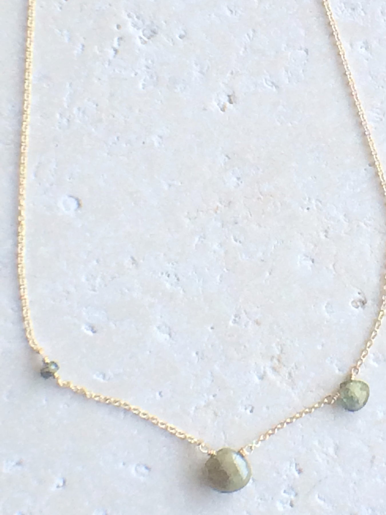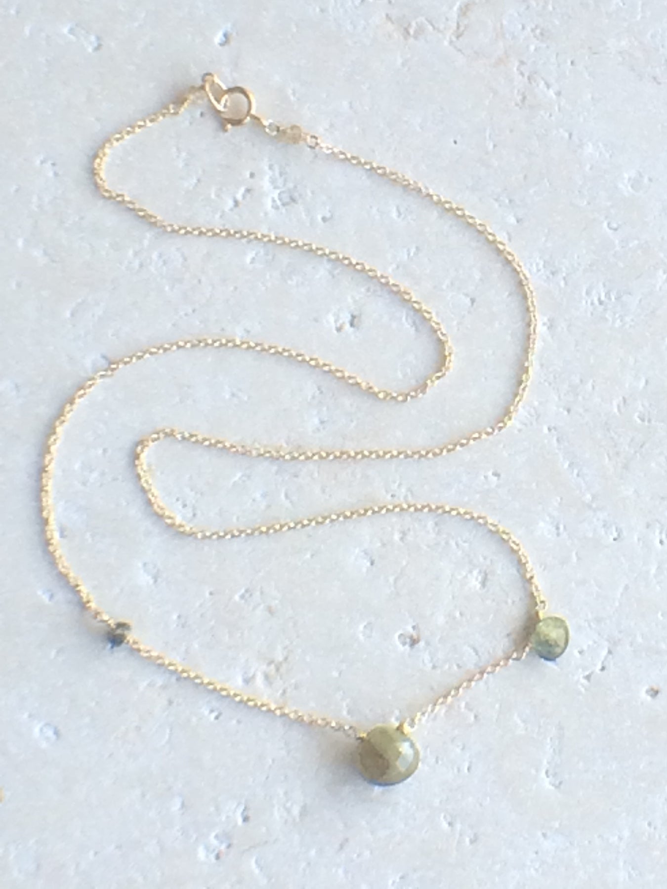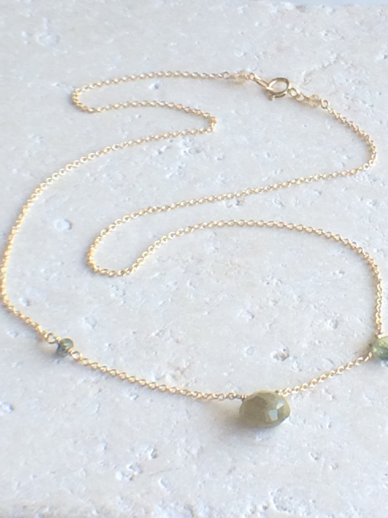 Easy asymmetric necklace with Green Sapphire stones wire wrapped on a 16 - 17" chain in 14kt gold fill.