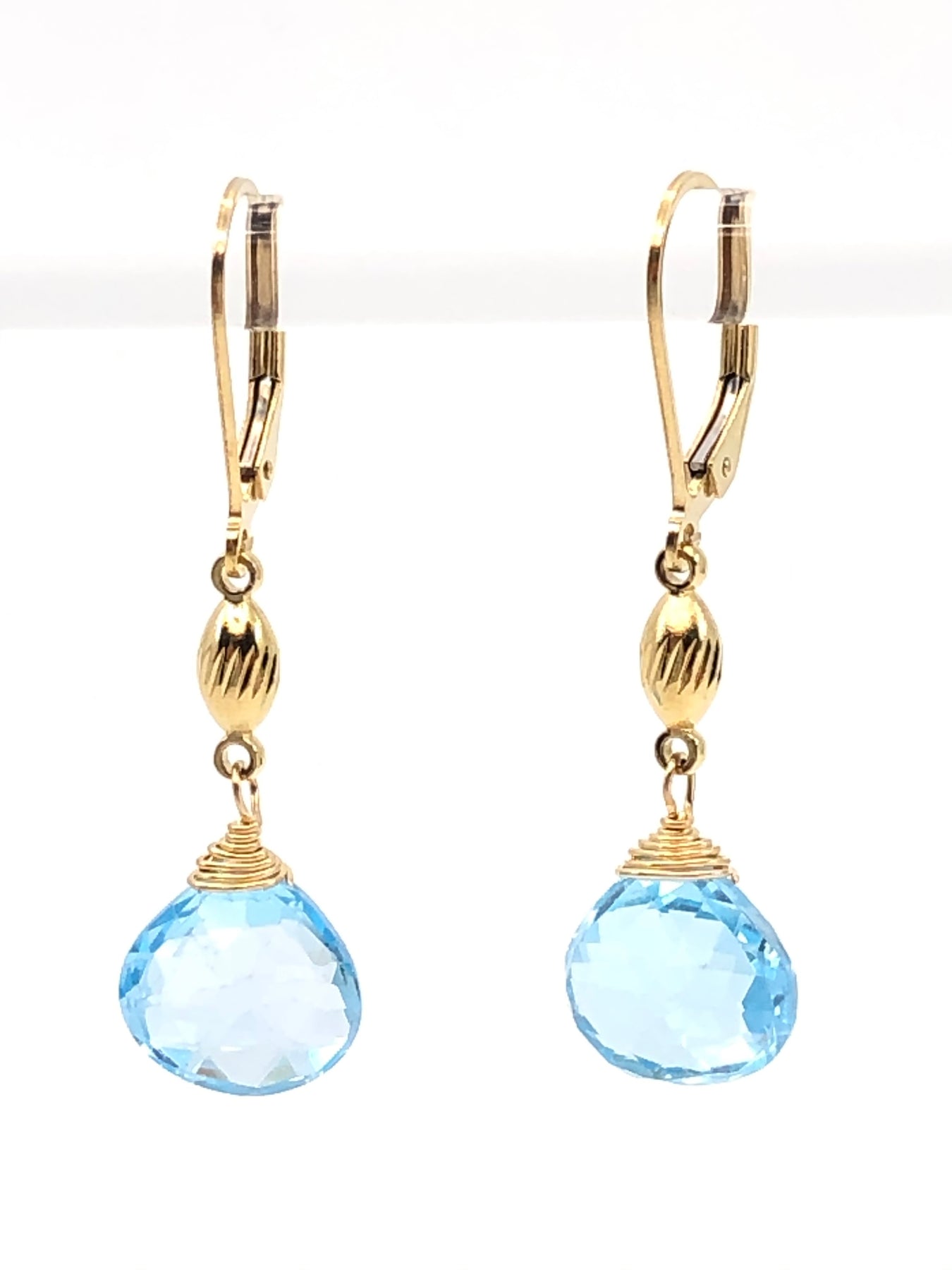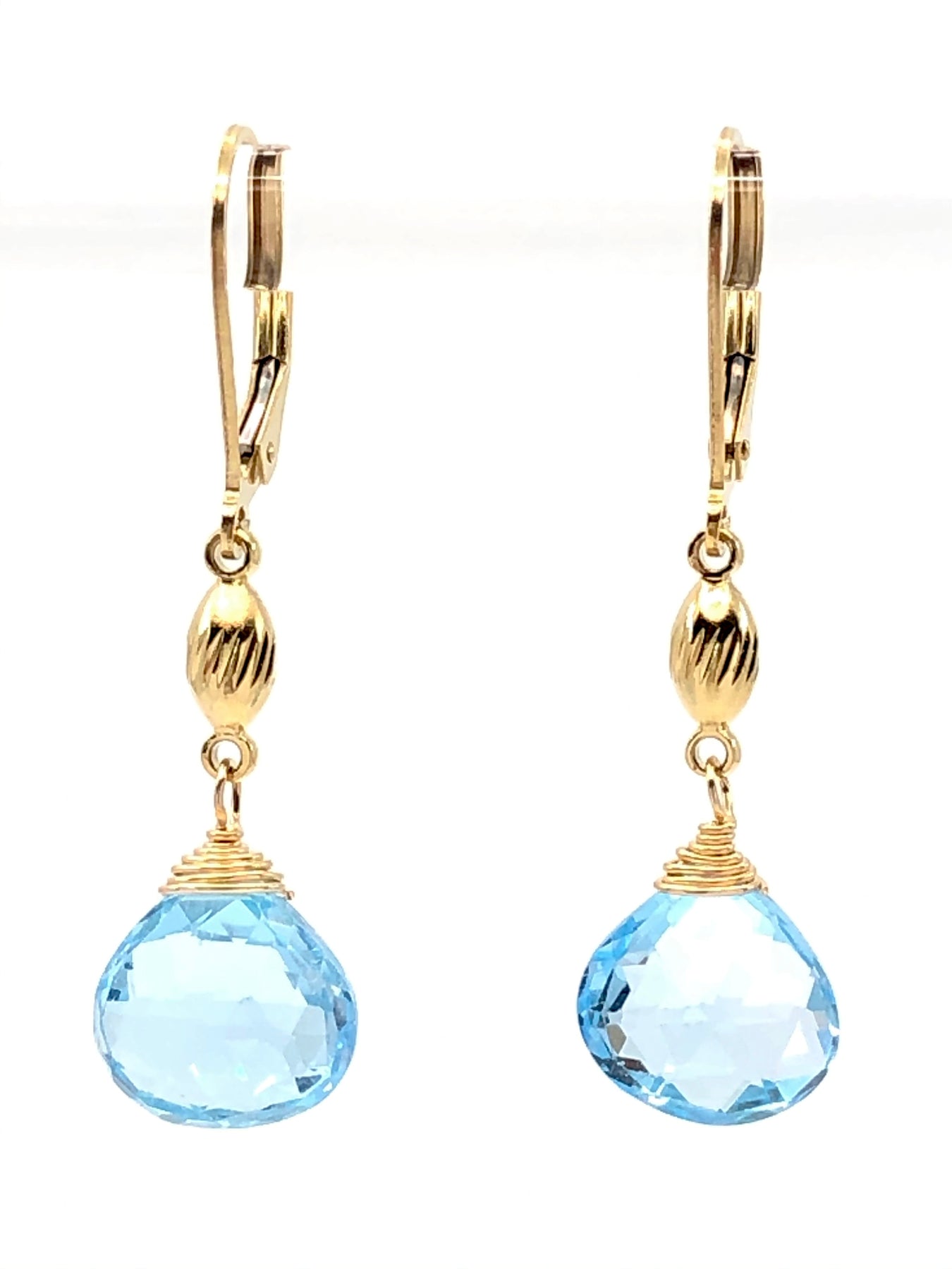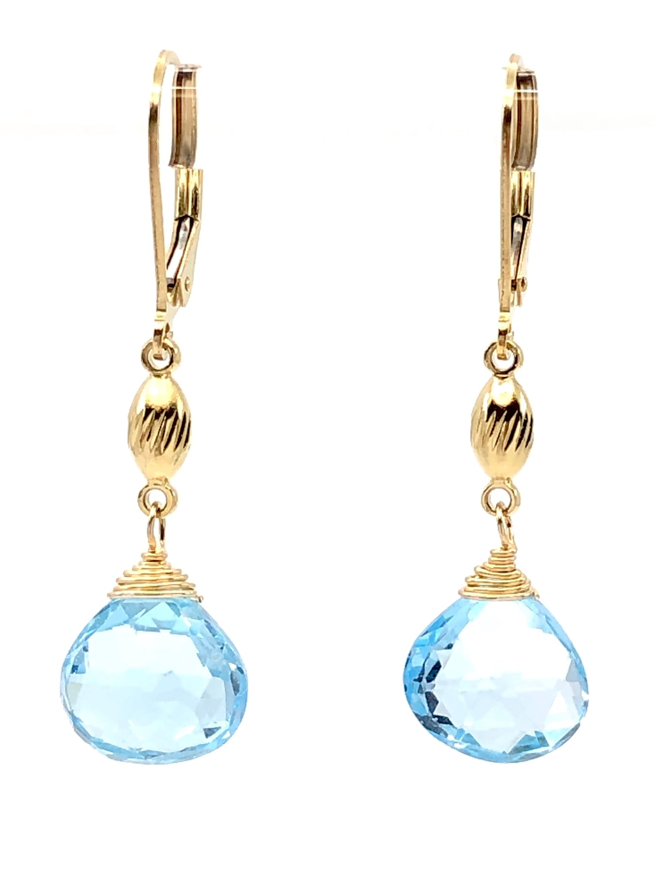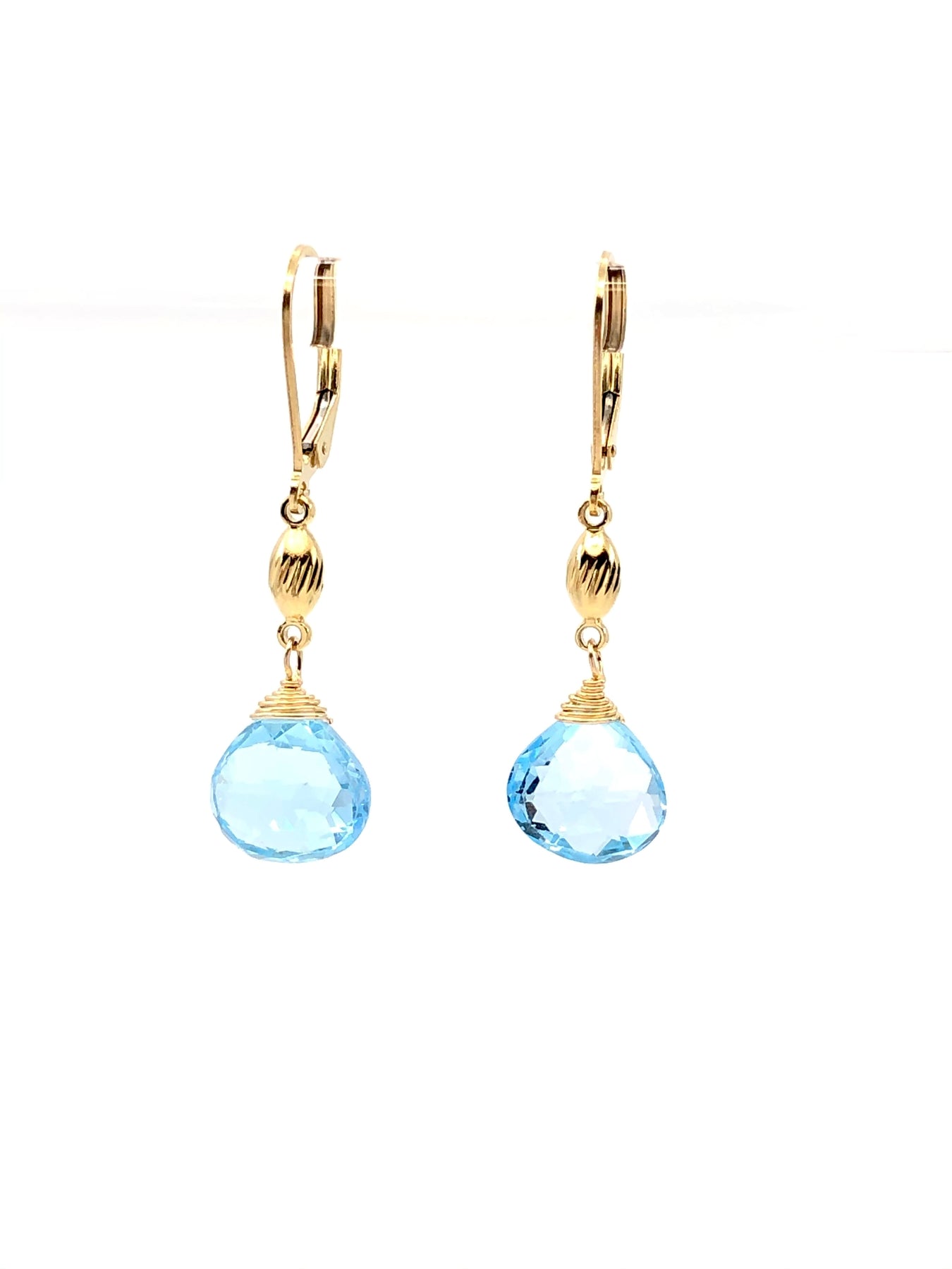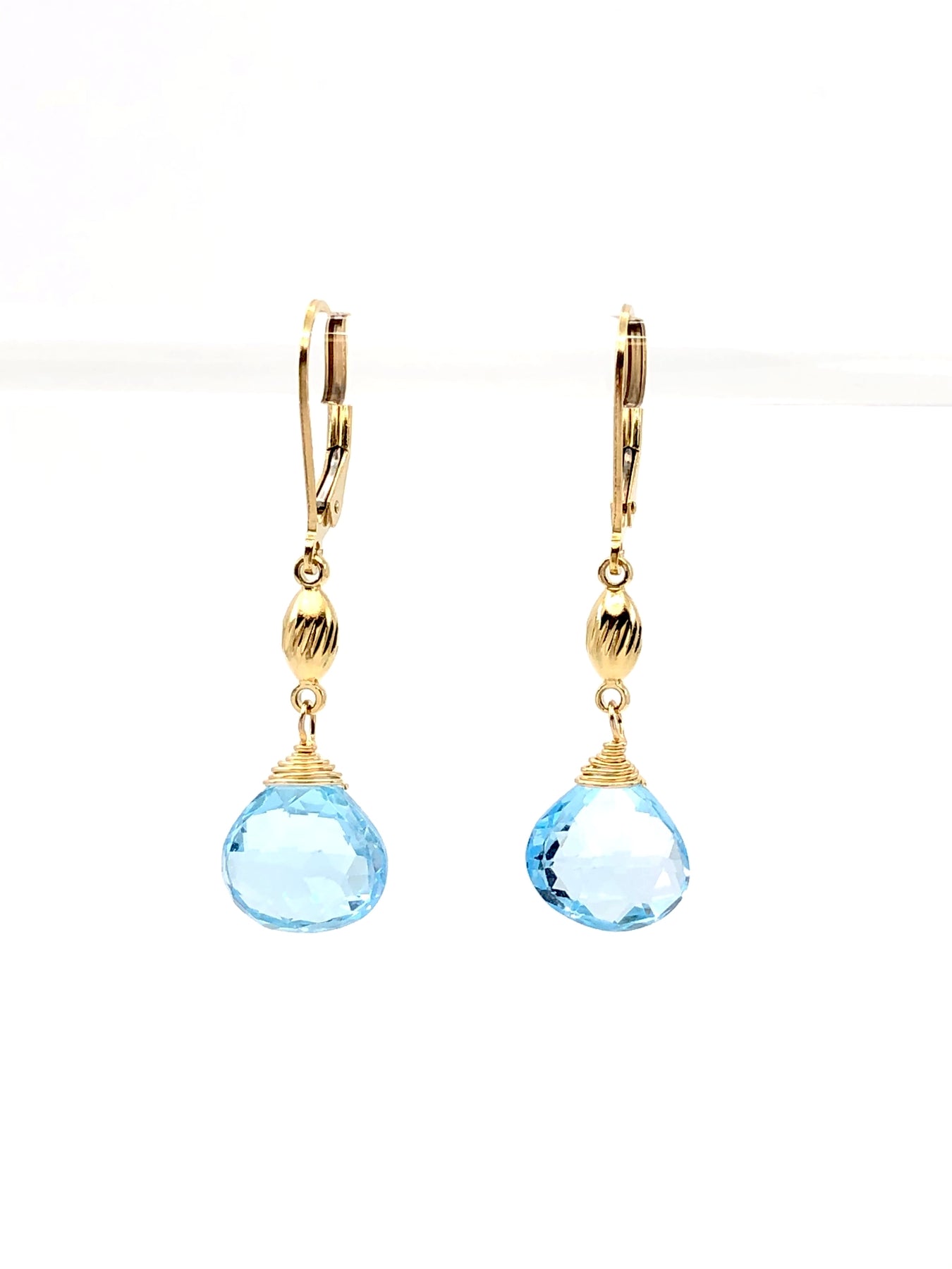 Gorgeous Blue Topaz earrings with a twisted bead drop all in 14kt gold fill. A perfect balance of neutral color these will go with any color and any outfit for all occasions.