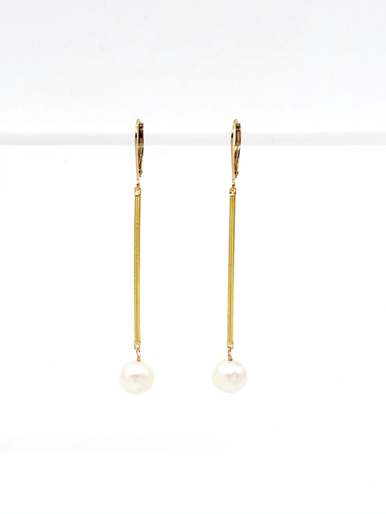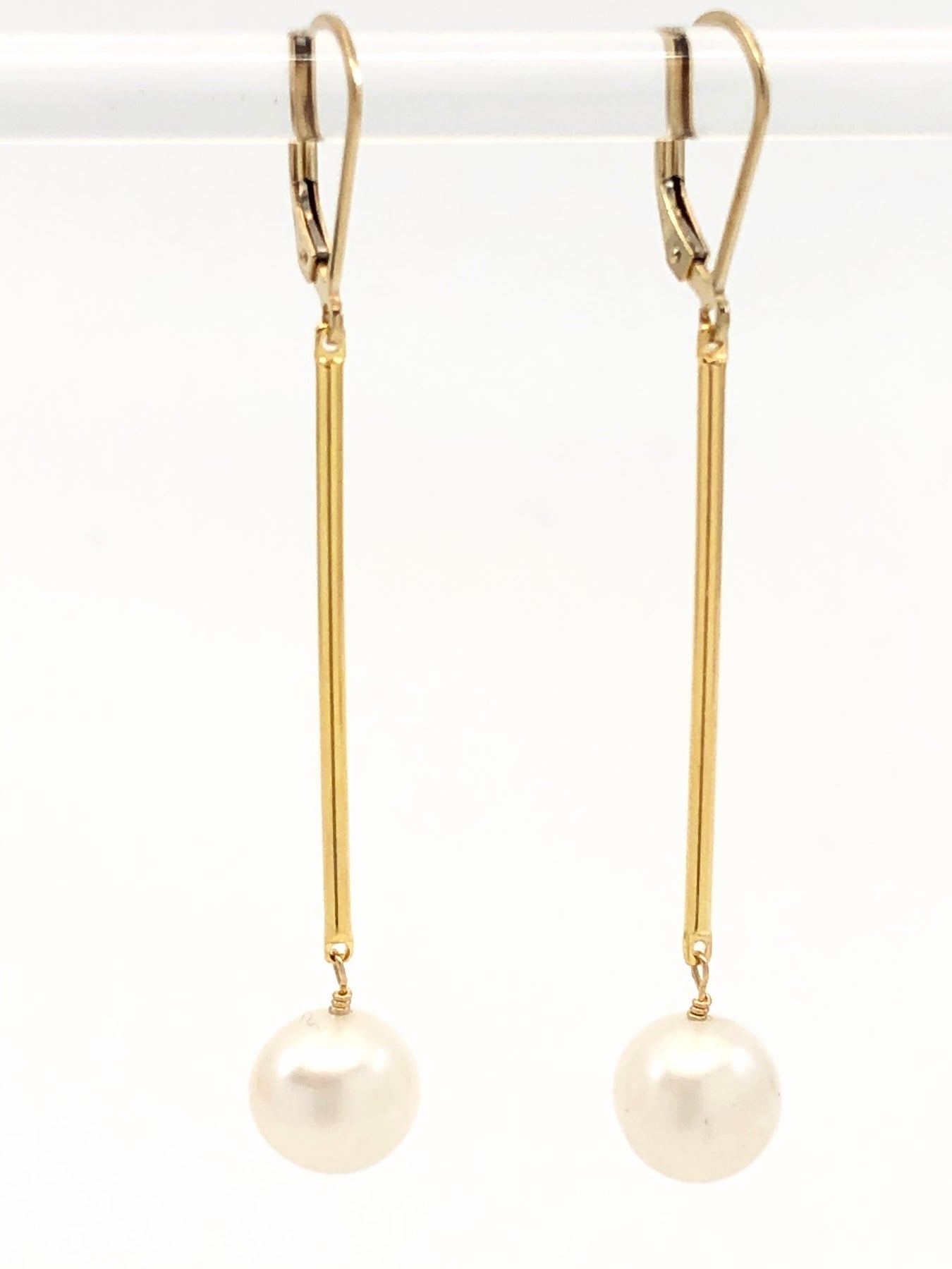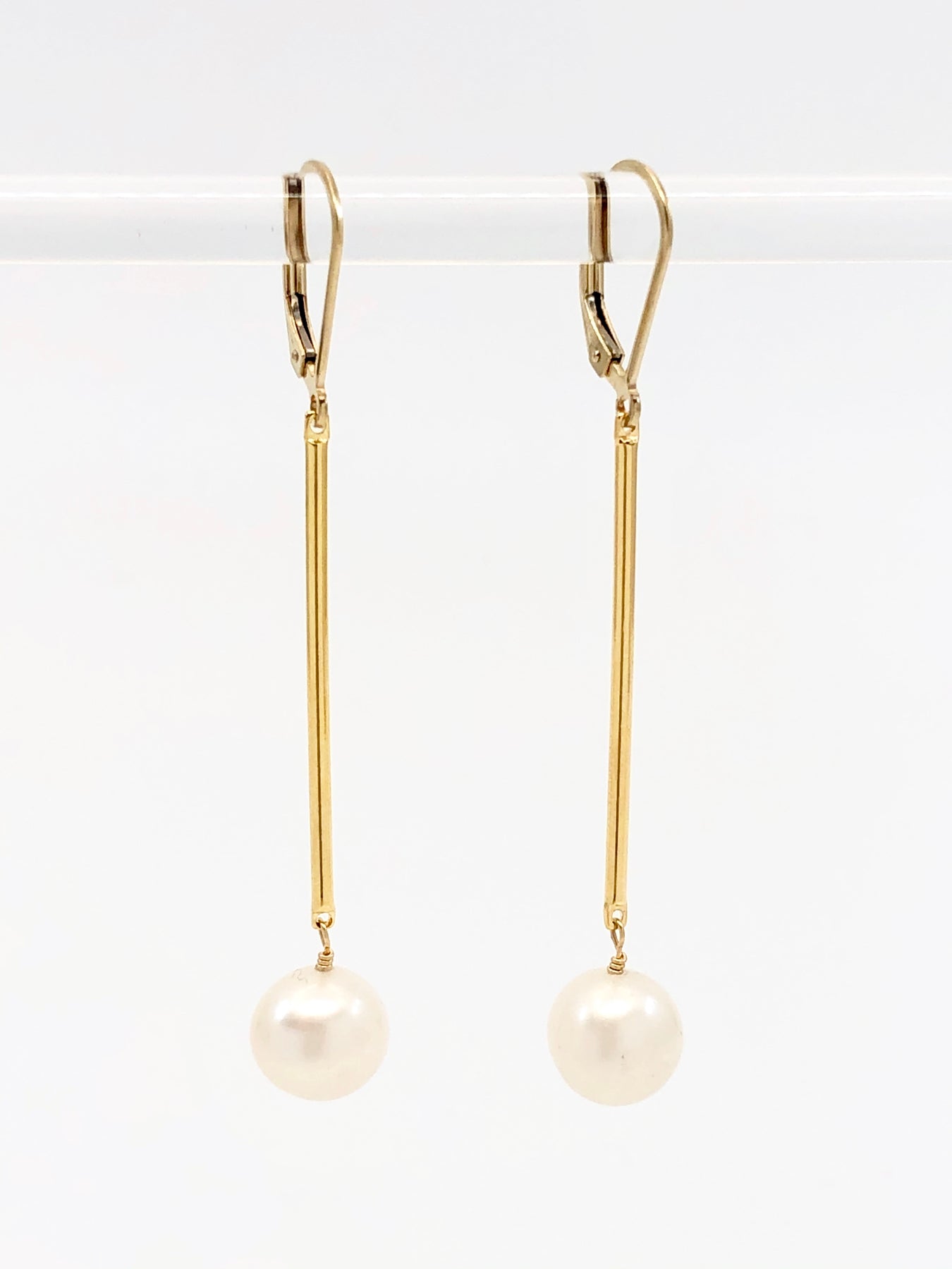 Swingy pearl earrings are simple and fun. Round natural white pearls hang on a 14kt gold vermeil bar with 14kt gold fill lever back ear wires.