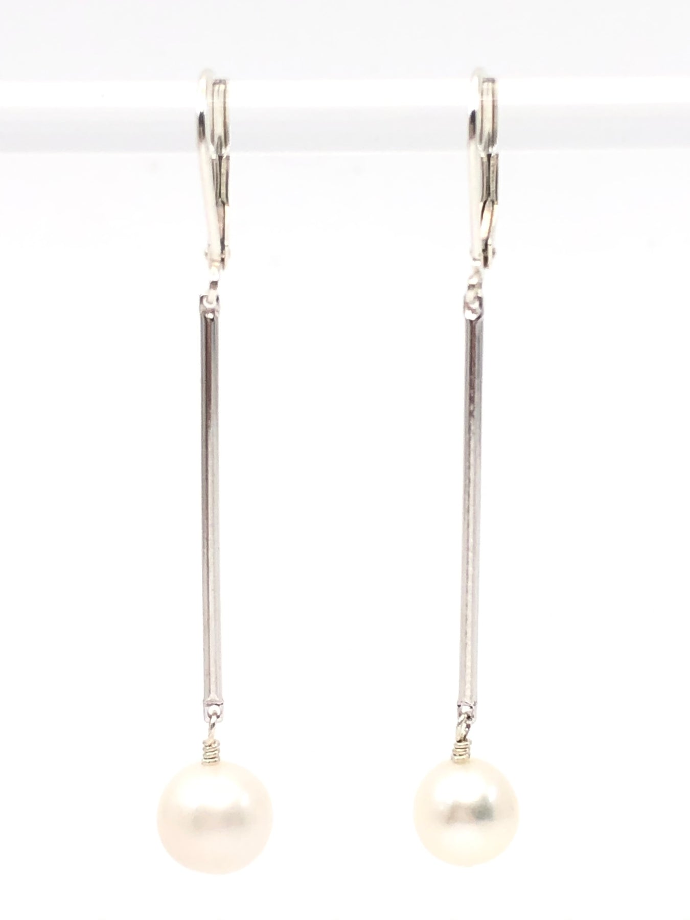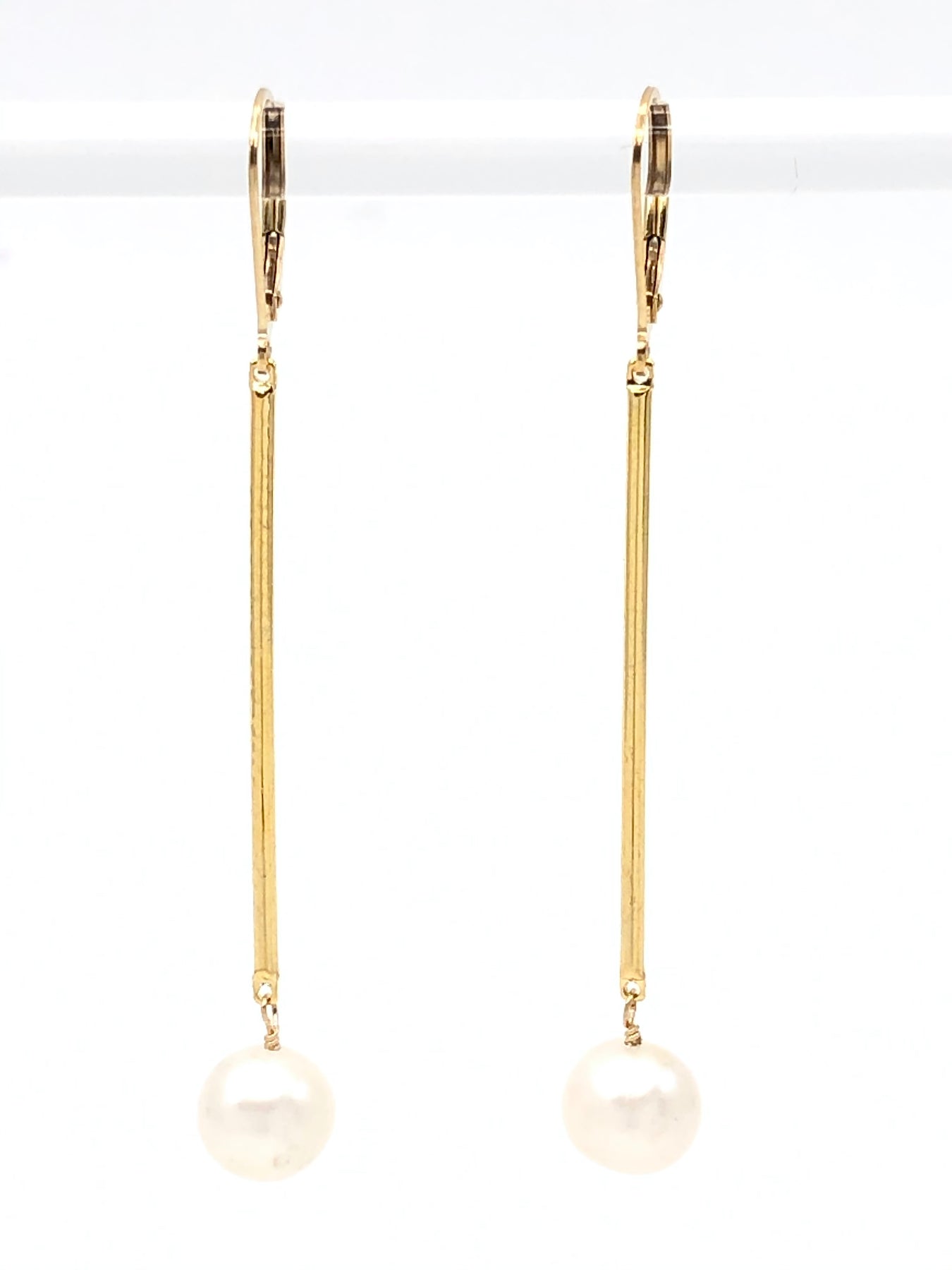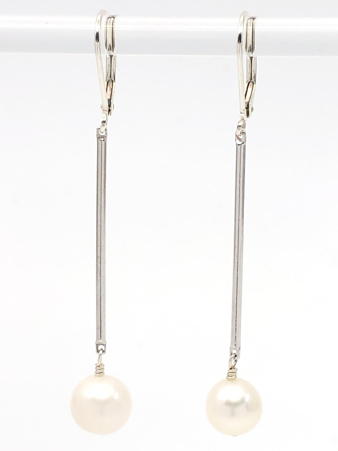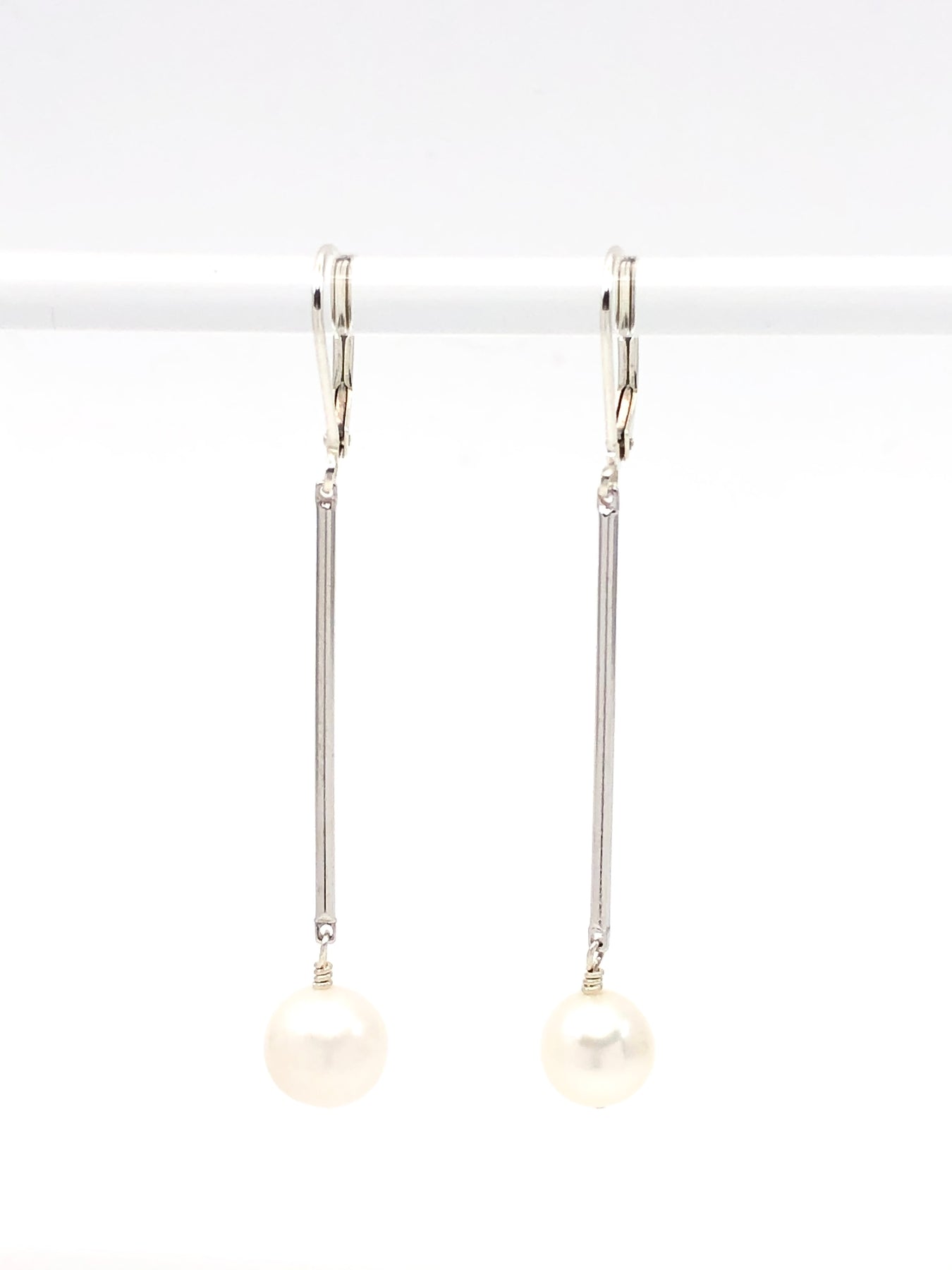 Swingy pearl earrings are simple and fun. Round natural white pearls hang on a 14kt gold vermeil bar with 14kt gold fill lever back ear wires.
