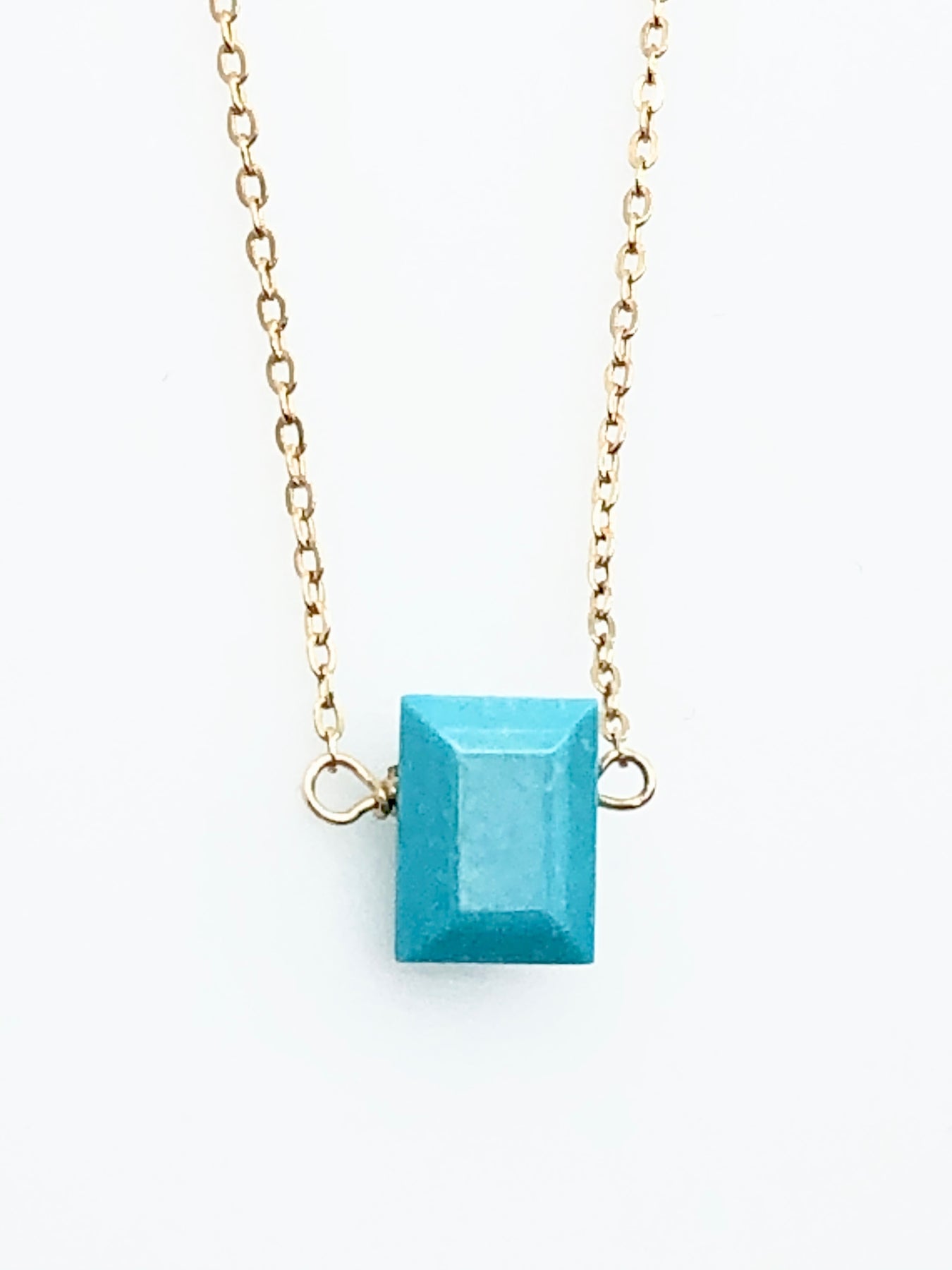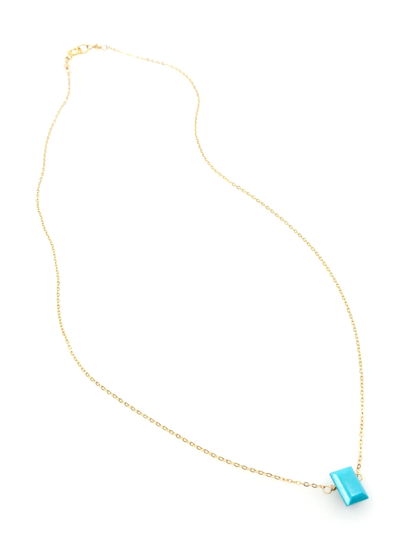 A classic cut Turquoise in a simple modern necklace 16" long. Light and fun to wear for that easy pop of color you can wear every day.