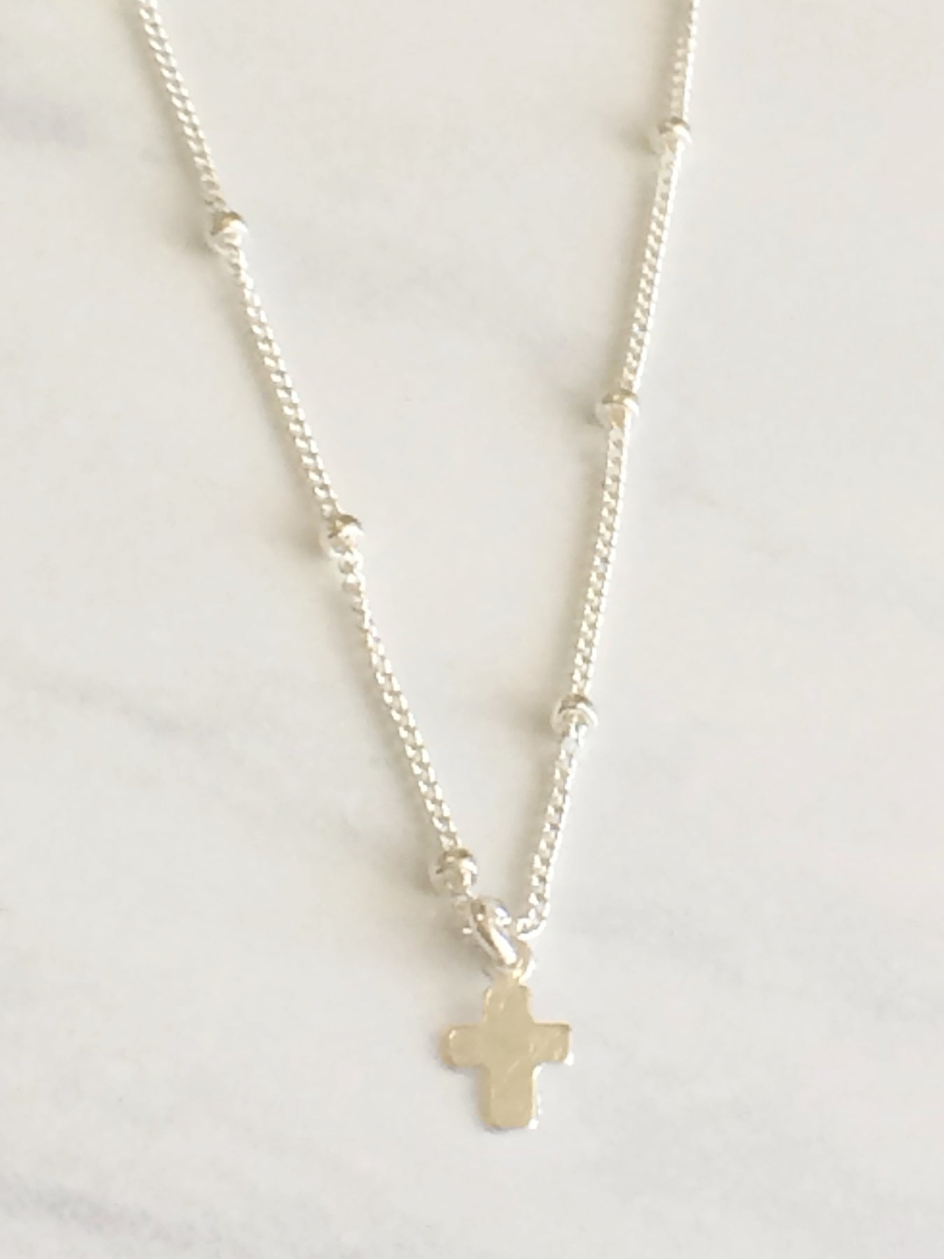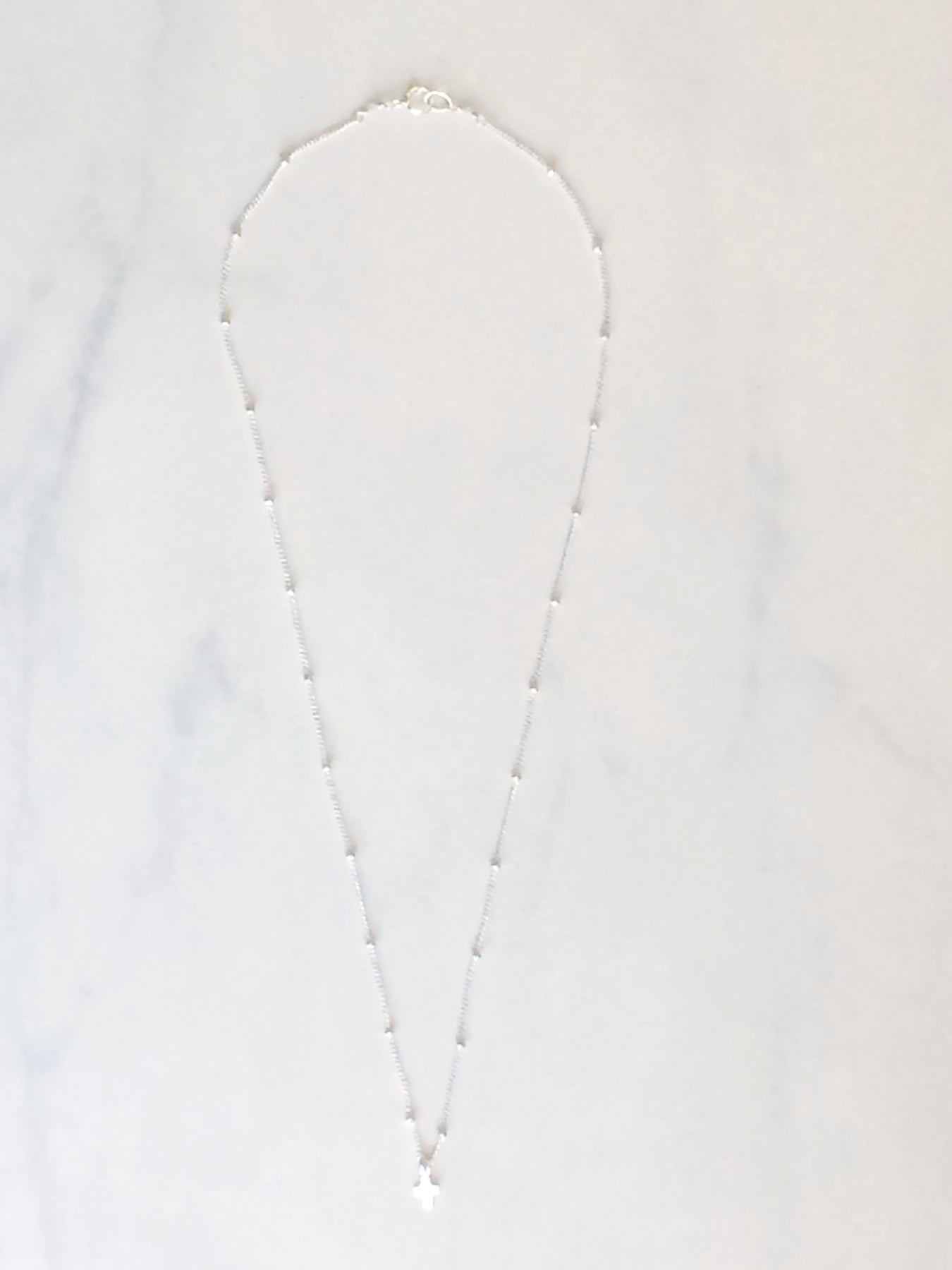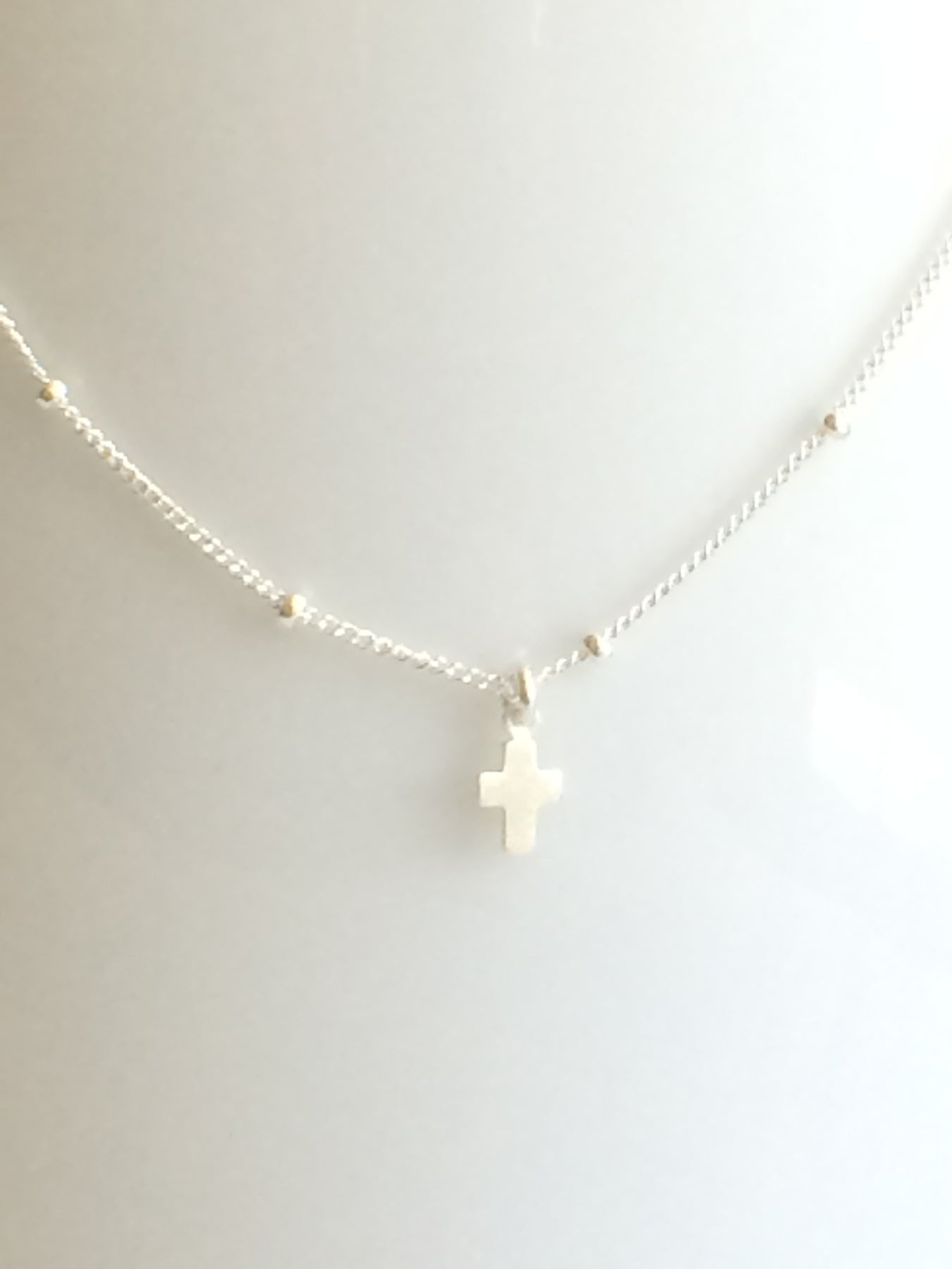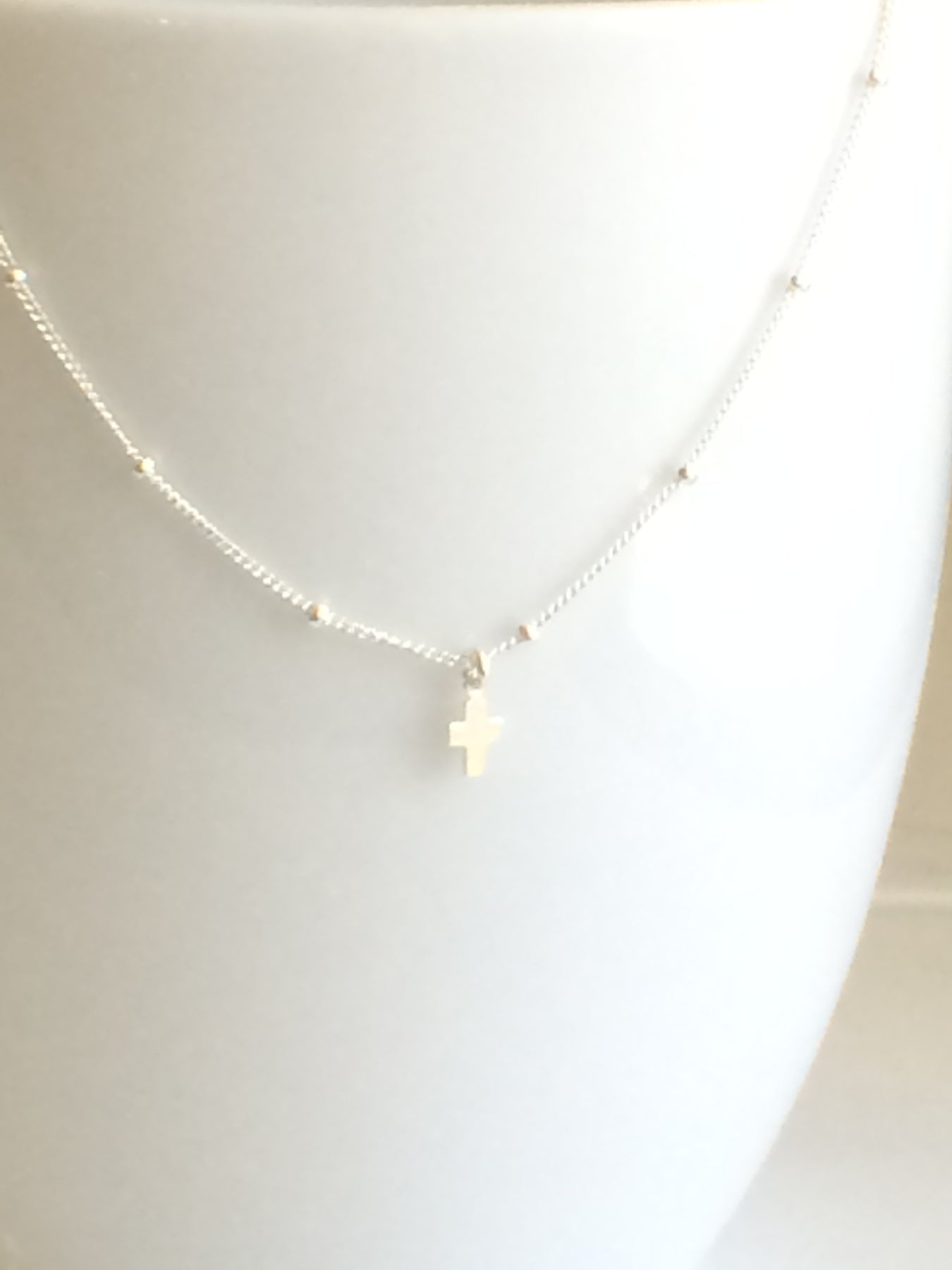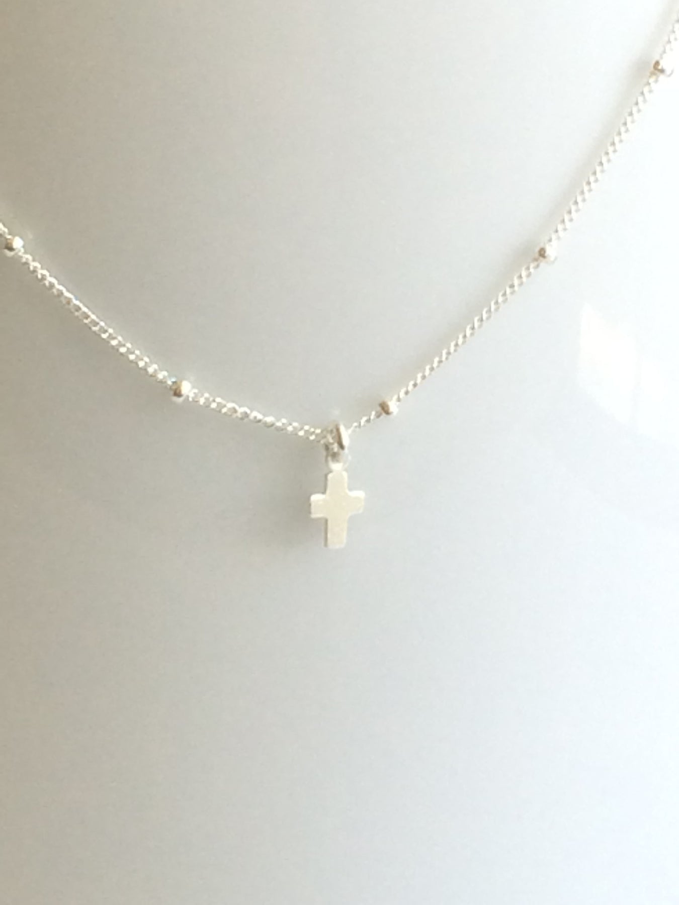 Sterling silver cross necklace is 16" long. Tiny cross charm is perfect and simple on a sterling silver satellite chain.