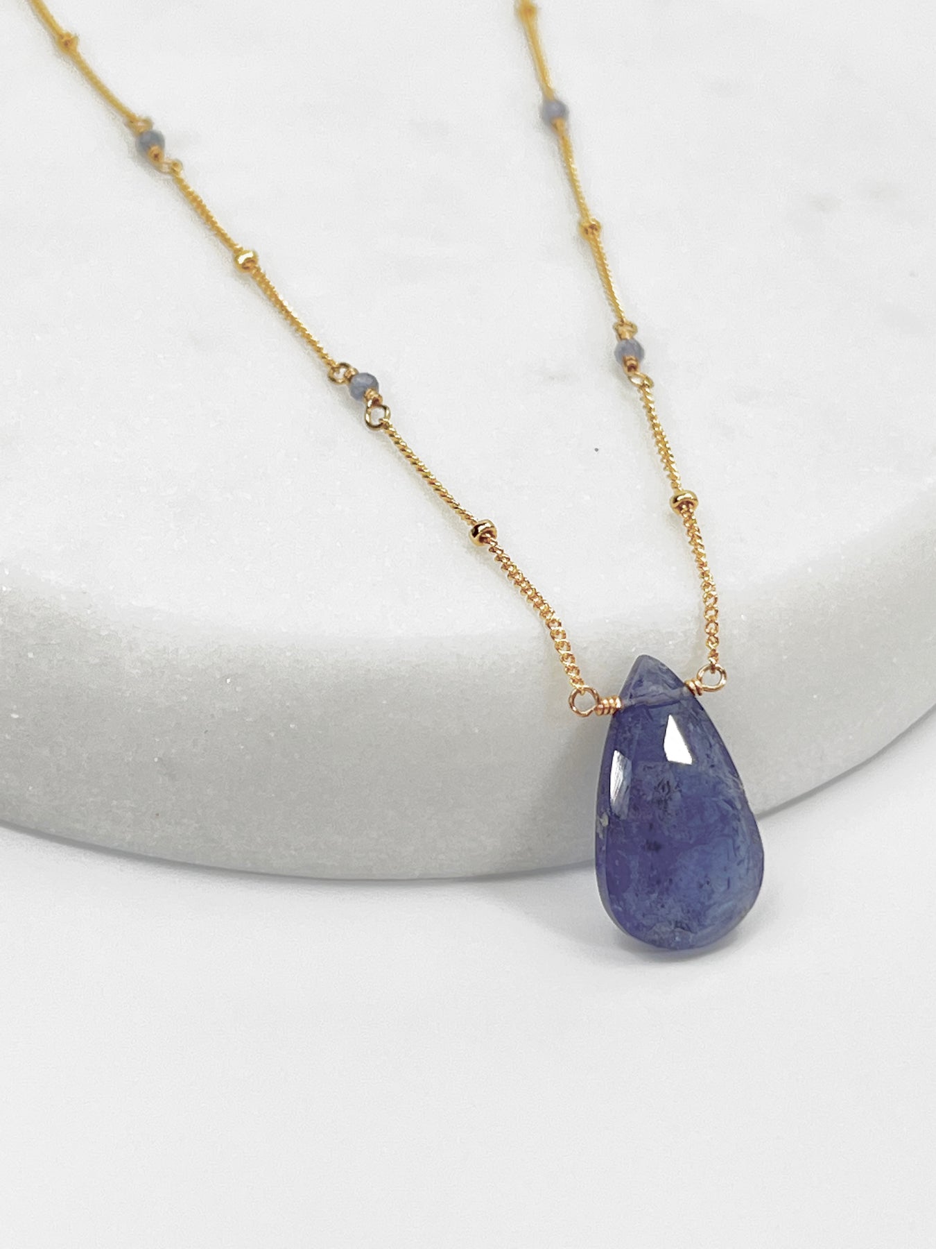 Beautiful large Tanzanite necklace on a beaded satellite chain sin 14kt gold fill. Necklace is 18" with 1" extender.